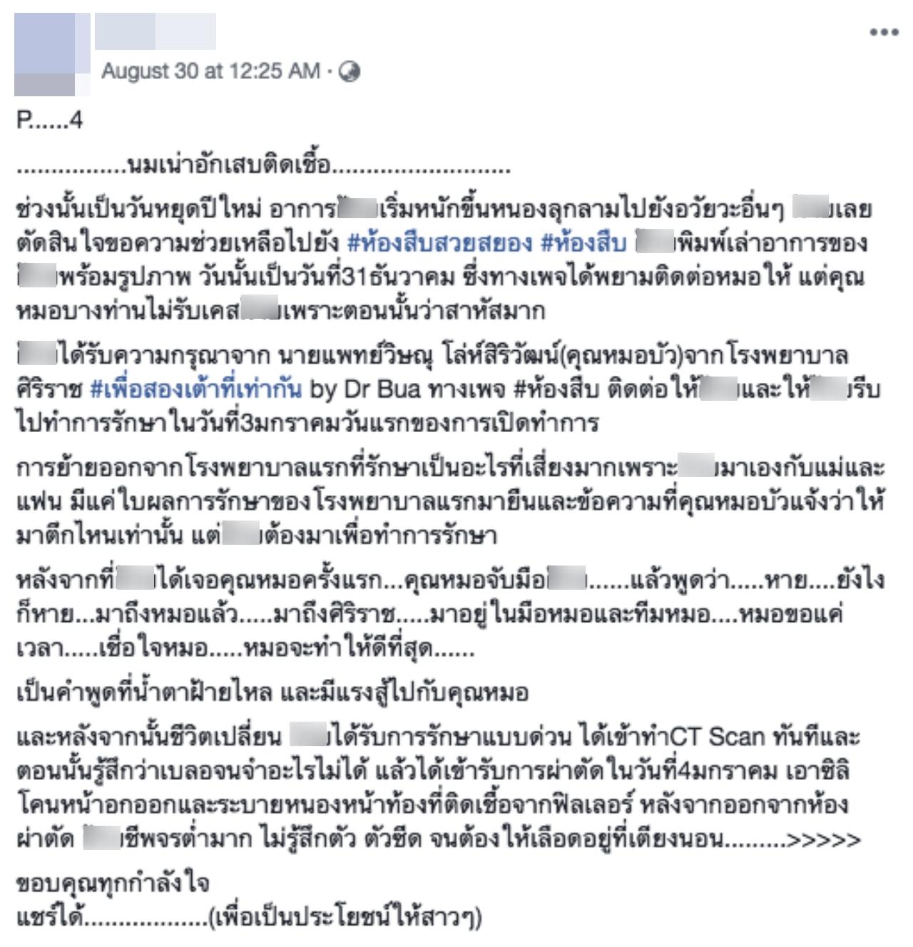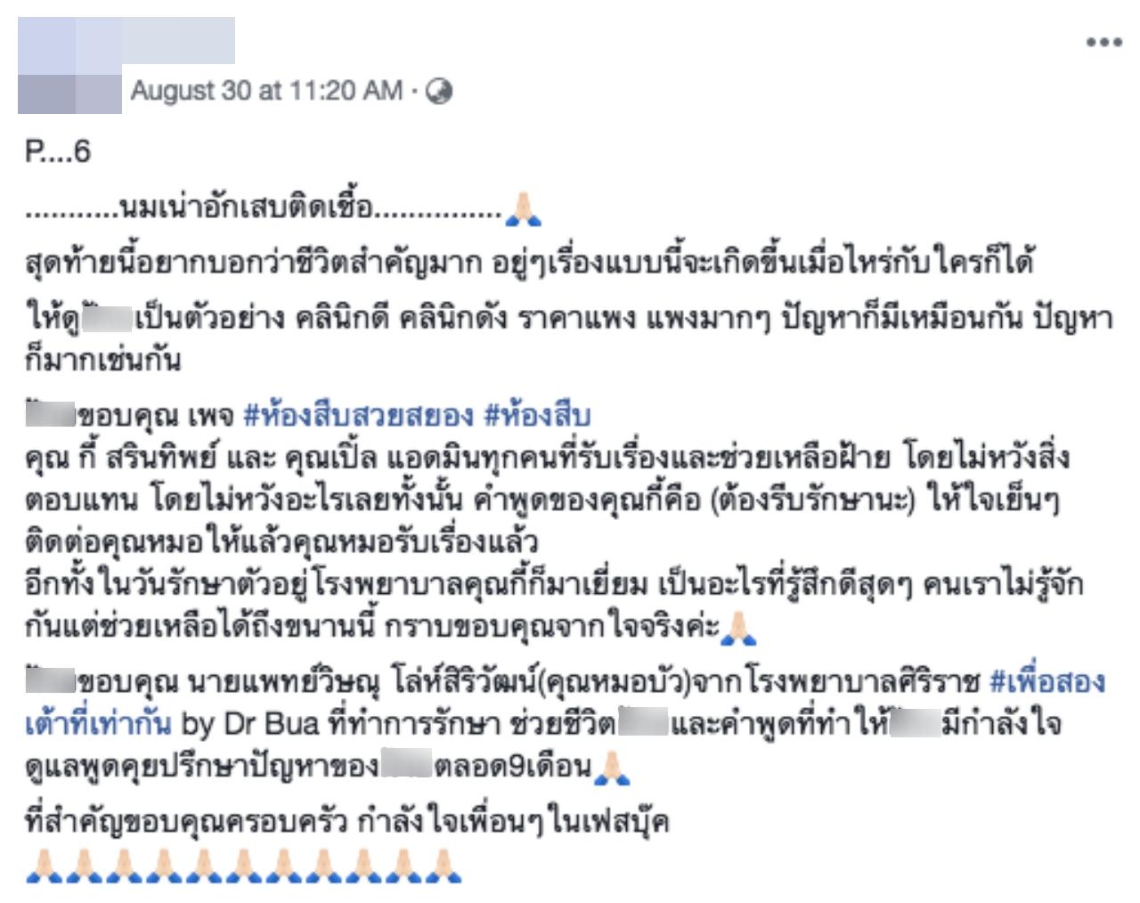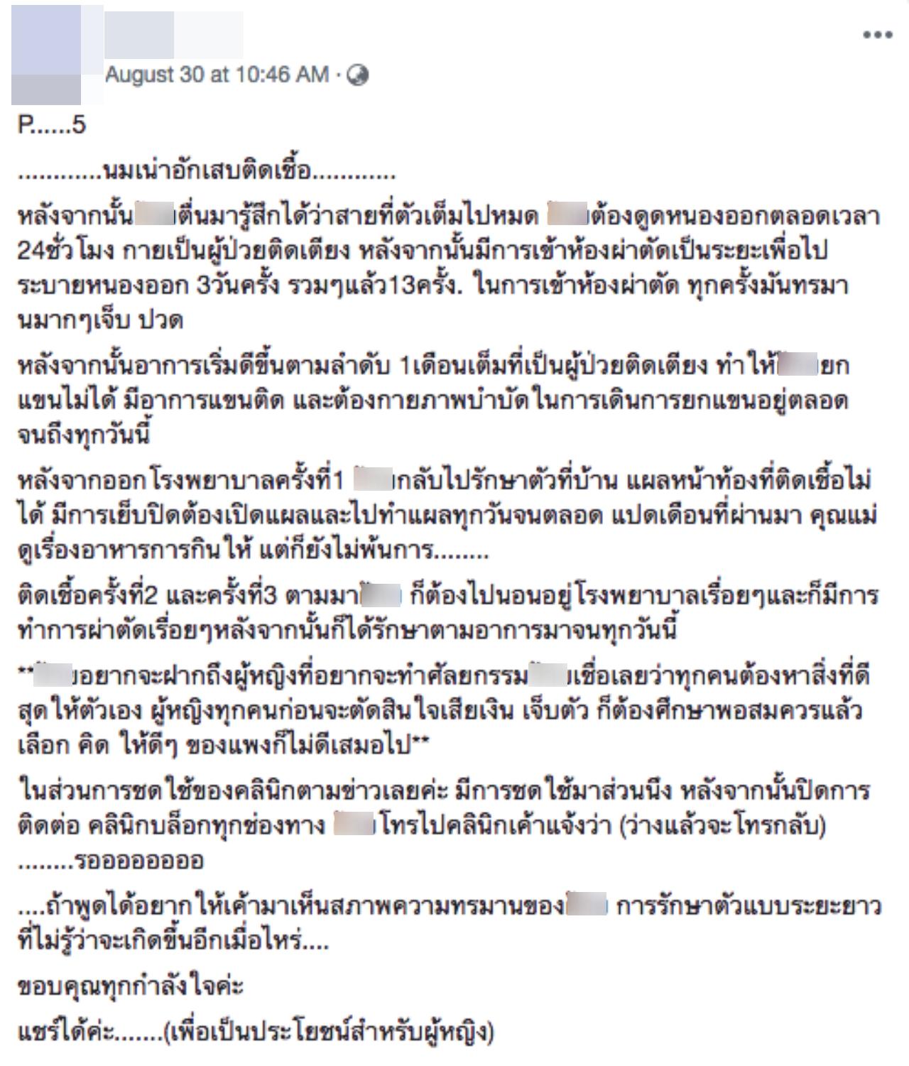 ต่อมา ตนได้ขอความช่วยเหลือไปทางเพจ ห้องสืบ และได้รักษากับ นายแพทย์วิษณุ โล่ห์สิริวัฒน์ (คุณหมอบัว) จากโรงพยาบาลศิริราช #เพื่อสองเต้าที่เท่ากัน ซึ่งเป็นการรักษาที่เร่งด่วน ต้องดูดหนองออกตลอดเวลา 24 ชั่วโมง หลังจากนั้นมีการเข้าห้องผ่าตัดเป็นระยะเพื่อไประบายหนองออก 3 วันครั้ง รวมๆ แล้ว 13 ครั้ง และในส่วนการชดใช้ของคลินิก มีการชดใช้มาส่วนหนึ่ง หลังจากนั้นปิดการติดต่อ คลินิกบล็อกทุกช่องทาง