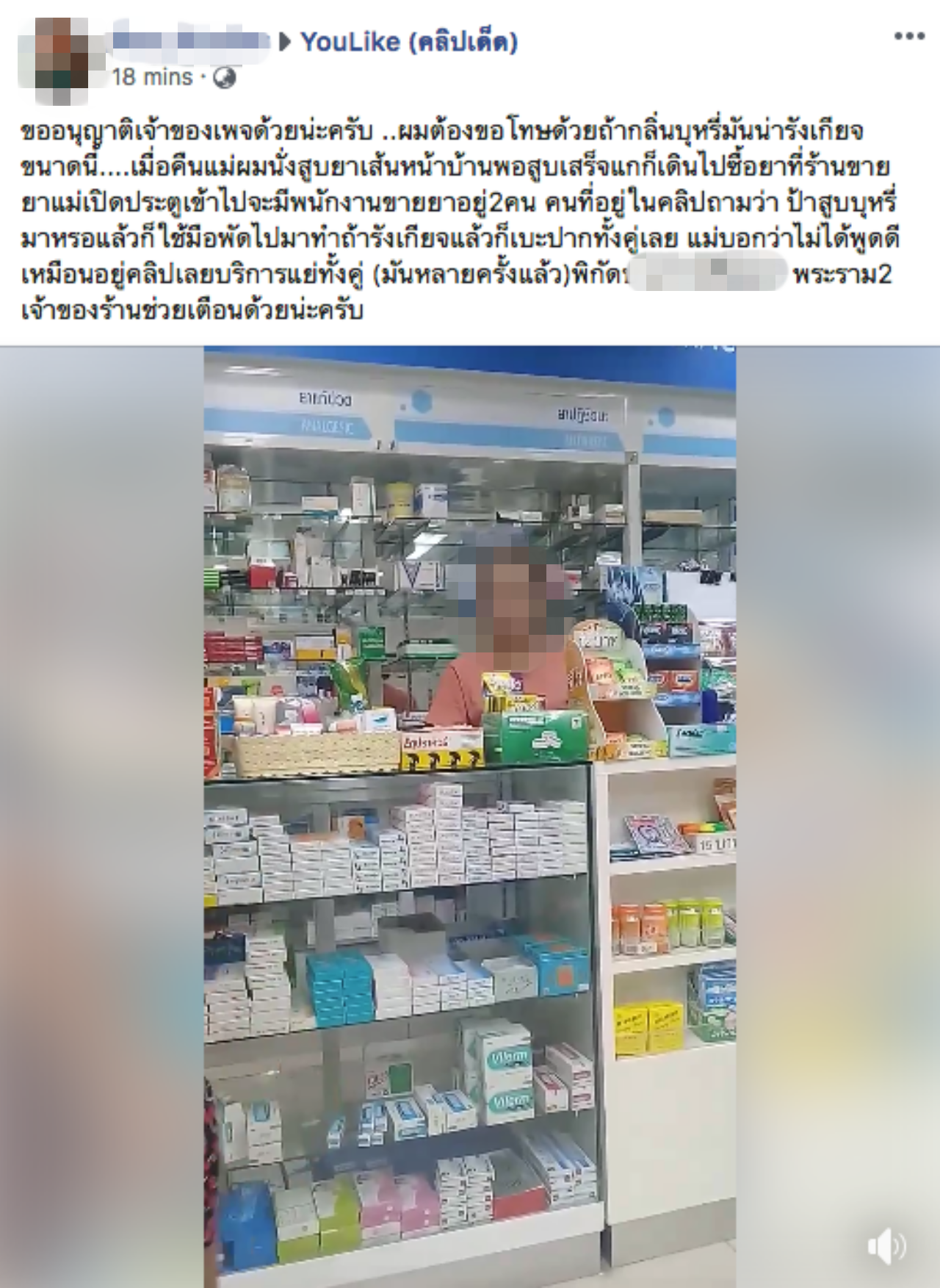 วันที่ 6 ก.ย. 61 ผู้ใช้เฟซบุ๊กรายหนึ่งโพสต์คลิปไปยังแฟนเพจเฟซบุ๊ก YouLike (คลิปเด็ด) พร้อมระบุข้อความว่า “ผมต้องขอโทษด้วยถ้ากลิ่นบุหรี่มันน่ารังเกียจขนาดนี้... เมื่อคืนแม่ผมนั่งสูบยาเส้นหน้าบ้าน พอสูบเสร็จแกก็เดินไปซื้อยาที่ร้านขายยา แม่เปิดประตูเข้าไปจะมีพนักงานขายยาอยู่ 2 คน คนที่อยู่ในคลิปถามว่า ป้าสูบบุหรี่มาเหรอ แล้วก็ใช้มือพัดไปมาทำท่ารังเกียจแล้วก็เบะปากทั้งคู่เลย แม่บอกว่าไม่ได้พูดดีเหมือนอยู่ในคลิปเลย บริการแย่ทั้งคู่ (มันหลายครั้งแล้ว) เจ้าของร้านช่วยเตือนด้วยนะครับ”