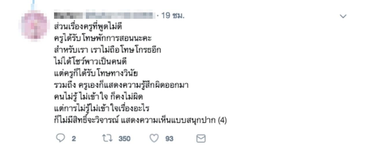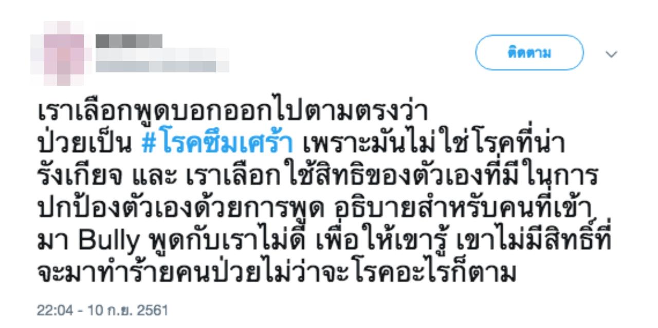 ทั้งนี้เจ้าของทวีตได้เล่าต่อว่า เราเลือกพูดบอกออกไปตามตรงว่า ป่วยเป็นโรคซึมเศร้า เพราะมันไม่ใช่โรคที่น่ารังเกียจ และเราเลือกใช้สิทธิ์ของตัวเองที่มีในการปกป้องตัวเองด้วยการพูด อธิบายสำหรับคนที่เข้ามา Bully พูดกับเราไม่ดี เพื่อให้เขารู้ เขาไม่มีสิทธิ์ที่จะมาทำร้ายคนป่วยไม่ว่าจะโรคอะไรก็ตาม