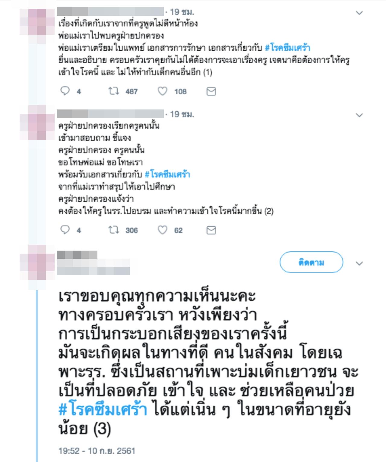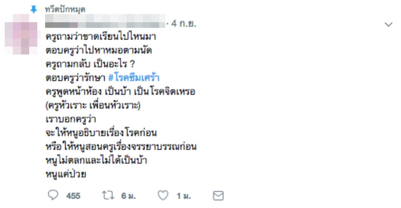 วันที่ 11 ก.ย.61 มีรายงานว่า ผู้ใช้ทวิตเตอร์รายหนึ่ง ซึ่งเป็นผู้ป่วยโรคซึมเศร้า ได้ทวีตข้อความเล่าเรื่องหน้าชั้นเรียนกับครูคนหนึ่ง โดยครูได้ถามว่าขาดเรียนไปไหนมา ตนจึงตอบว่า ไปหาหมอตามนัด รักษาโรคซึมเศร้า แต่ครูกลับพูดหน้าห้องว่า เป็นบ้า เป็นโรคจิตเหรอ (ครูหัวเราะ เพื่อนหัวเราะ) ตนจึงบอกครูว่า "จะให้หนูอธิบายเรื่องโรคก่อนหรือให้หนูสอนครูเรื่องจรรยาบรรณก่อน หนูไม่ตลกและไม่ได้เป็นบ้า หนูแค่ป่วย"