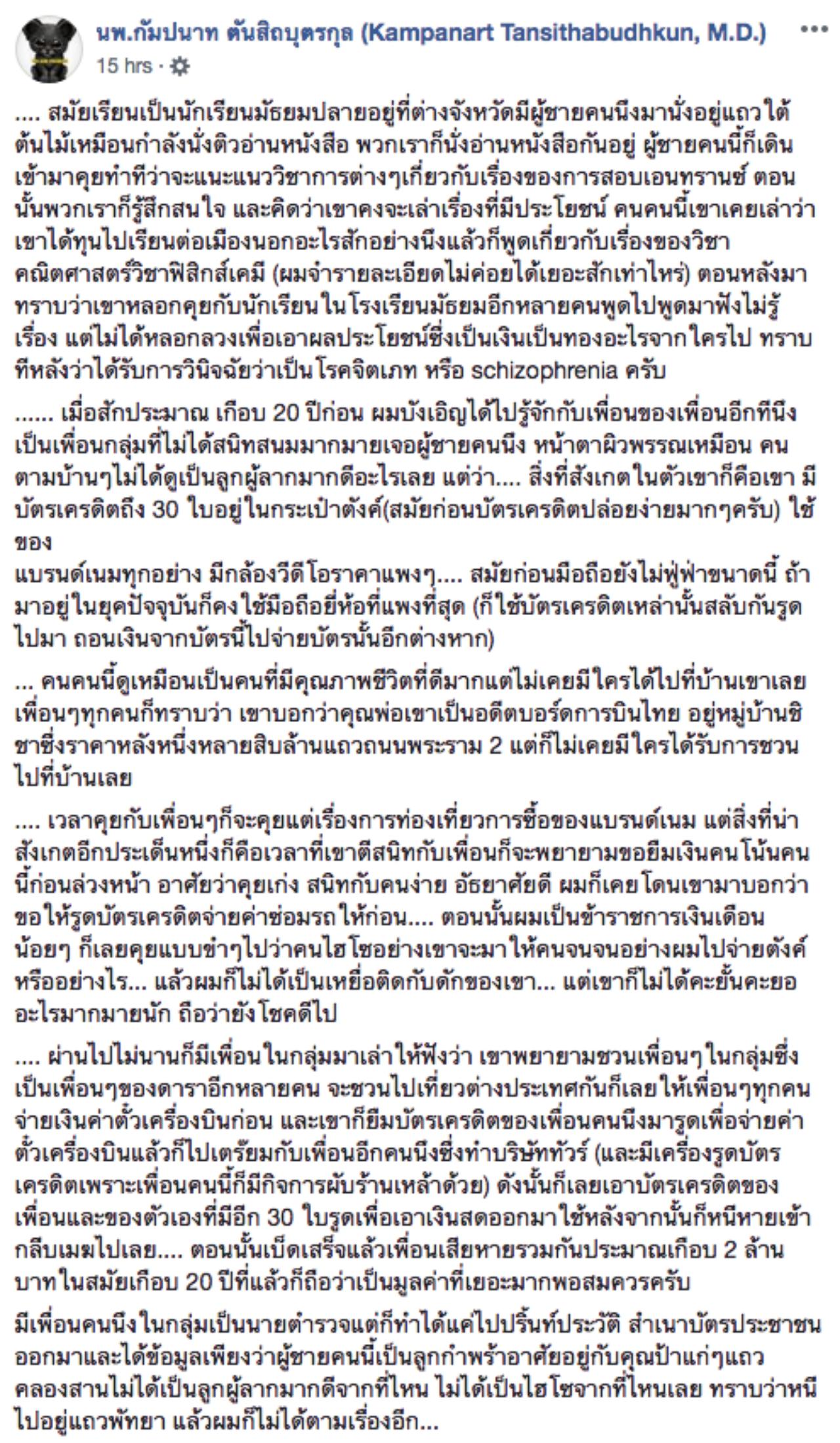 ล่าสุด (11 ก.ย.61) มีรายงานว่า นพ.กัมปนาท ตันสิถบุตรกุล จิตแพทย์ชื่อดัง ได้โพสต์ข้อความยกตัวอย่างเหตุการณ์ 2 กรณี เพื่อให้เห็นความต่างของผู้ป่วยโรคจิตเภท กับมิจฉาชีพ โดยเล่าว่า