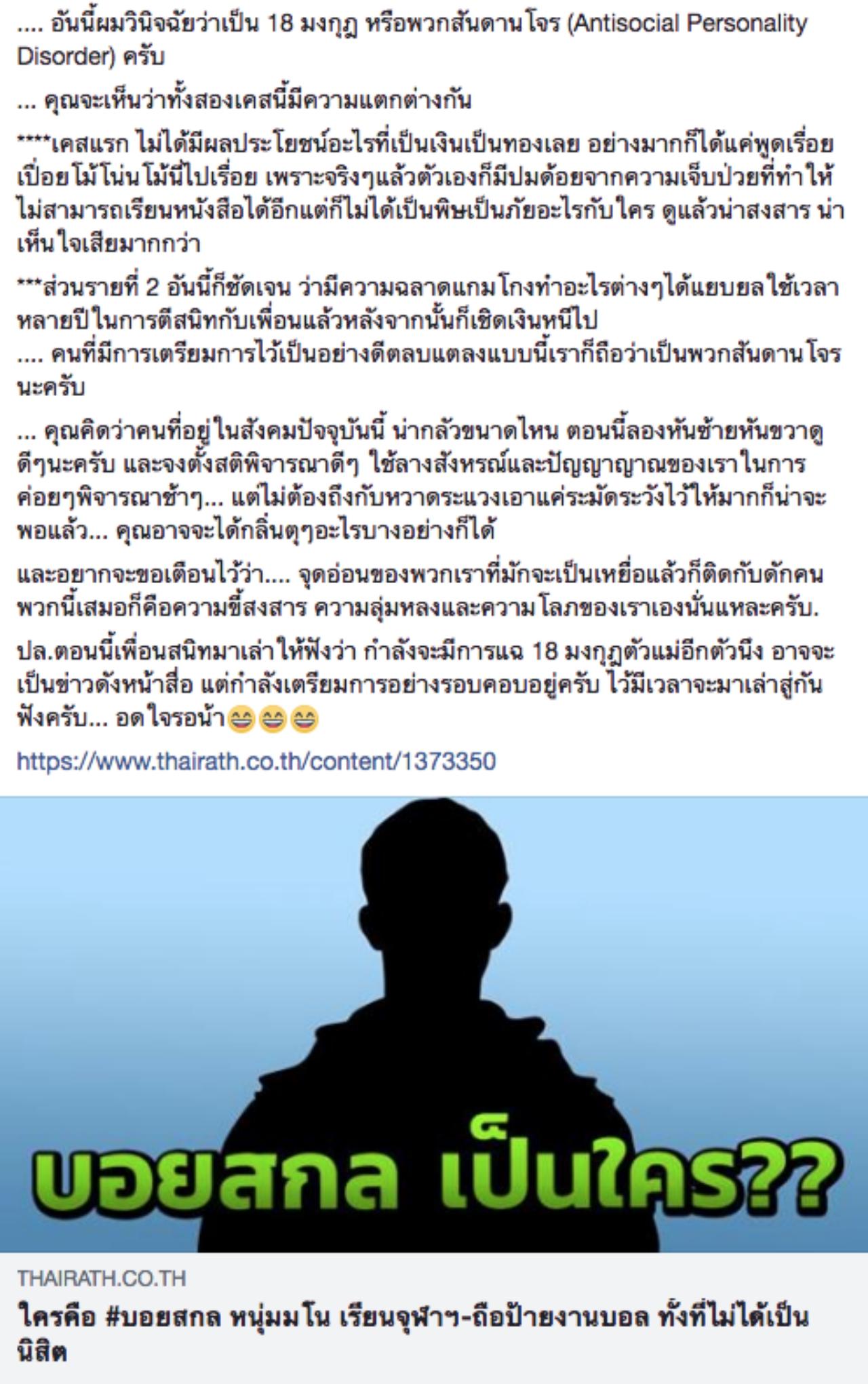 ในตอนนั้นมีผู้เสียหายรวมกันเกือบ 2 ล้านบาท เมื่อสืบประวัติก็พบว่า ชายคนนี้เป็นเด็กกำพร้าอาศัยอยู่กับคุณป้า ไม่ได้เป็นไฮโซ และทราบว่าหนีไปอยู่แถวพัทยา อันนี้วินิจฉัยว่าเป็น 18 มงกุฎ หรือพวกสันดานโจร (Antisocial Personality Disorder)