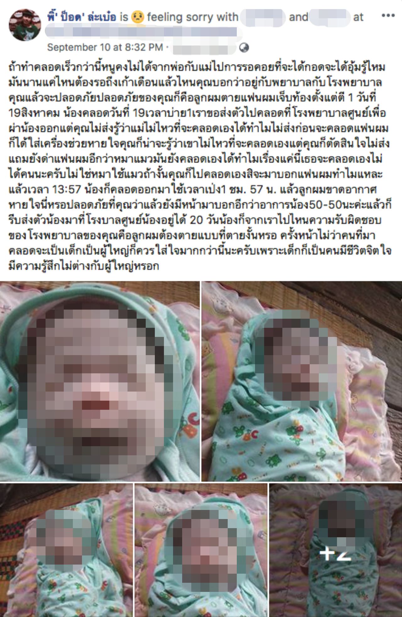 ผู้ใช้เฟซบุ๊ก พิ๊' ป็อด' ล่ะเบ๋อ โพสต์เรื่องสุดเศร้าของครอบครัวหลังต้องสูญเสียลูกน้อยที่เพิ่งคลอดได้เพียง 20 วัน โดยเจ้าตัวโพสต์ตัดพ้อว่า “ถ้าทำคลอดเร็วกว่านี้คงไม่ได้จากพ่อกับแม่ไป” ทั้งนี้ เจ้าของโพสต์ผู้เป็นพ่อบอกว่า แฟนสาวเจ็บท้องช่วง 01.00 น. ของวันที่ 19 ส.ค. ที่ผ่านมา แต่ลูกได้คลอดตอน 13.57 น. พร้อมเล่าว่าแฟนสาวต้องใส่เครื่องช่วยหายใจและดูท่าทางไม่มีแรงที่จะคลอดเองได้ แต่โรงพยาบาลกลับไม่ส่งต่อไปยังโรงพยาบาลศูนย์ไปเพื่อผ่าคลอด และยังมีคำพูดที่ไม่เข้าทีว่า “ด่าแฟนผมว่าหมาแมวมันยังคลอดเองได้ ทำไมเรื่องแค่นี้เธอจะคลอดเองไม่ได้”