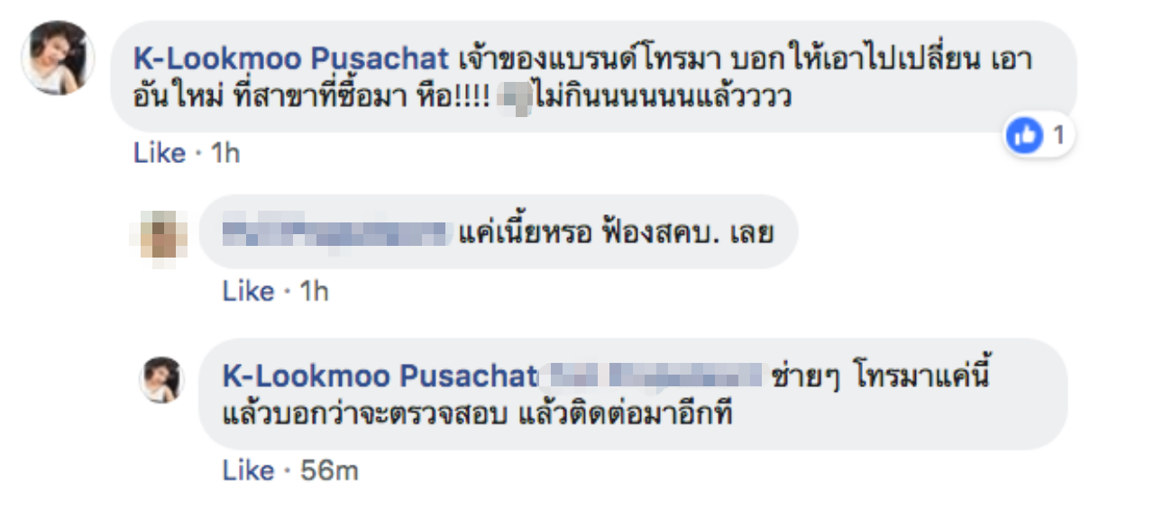 ผู้ใช้เฟซบุ๊ก K-Lookmoo Pusachat โพสต์ภาพและคลิปพร้อมคำบรรยายว่า “อวสาน อิ่มเลยจ้า” จากคลิปพบเห็นสิ่งผิดปกติในไส้กรอกยี่ห้อหนึ่งที่ซื้อมาจากร้านสะดวกซื้อ จากนั้นใช้แหนบดึงออกดู ถึงจะตะลึงเมื่อพบว่าเป็นผมเส้นยาวเส้นหนึ่ง พร้อมกันนี้ เจ้าตัวได้บอกในช่องแสดงความเห็นด้วยว่า ทางแบรนด์โทรมาบอกให้เอาไปเปลี่ยนอันใหม่ที่สาขาที่ซื้อมา แต่ก็ไม่อยากกินแล้ว ส่วนชาวเน็ตที่ได้เห็นก็เข้ามาแสดงความคิดเห็นกันเป็นจำนวนไม่น้อย.