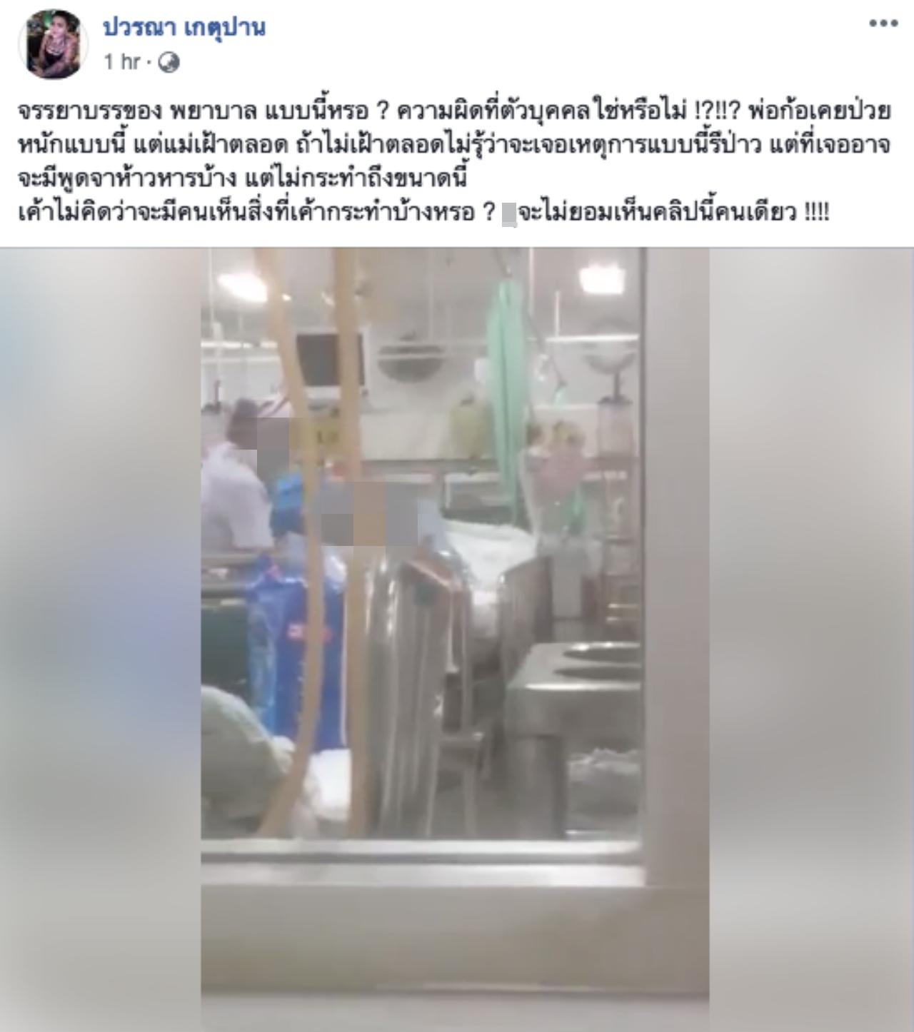 วันที่ 25 ก.ย.61 มีรายงานว่า เฟซบุ๊ก ปวรณา เกตุปาน ได้โพสต์คลิปพยาบาลคนหนึ่งกระชากร่างของผู้ป่วยที่นอนอยู่บนเตียงอย่างแรง พร้อมกับระบุข้อความว่า จรรยาบรรณของพยาบาลแบบนี้หรอ? ความผิดที่ตัวบุคคลใช่หรือไม่ !?!!? พ่อก็เคยป่วยหนักแบบนี้ แต่แม่เฝ้าตลอด