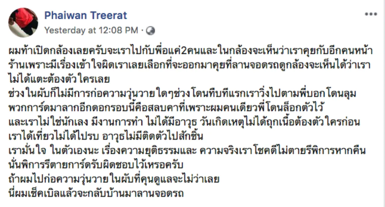 ต่อมาเจ้าตัวได้โพสต์เพิ่มเติมว่า “ผมท้าเปิดกล้องเลยครับ เราไปกับพี่แค่ 2 คน และในกล้องจะเห็นว่าเราคุยกับอีกคนหน้าร้านเพราะมีเรื่องเข้าใจผิด เราเลยเลือกที่จะออกมาคุยที่ลานจอดรถ ดูกล้องจะเห็นได้ว่าเราไม่ได้แตะต้องตัวใครเลย ช่วงในผับก็ไม่มีการก่อความวุ่นวายใดๆ ช่วงโดนทืบทีแรกเราวิ่งไปตามพี่บอกโดนรุม พวกการ์ดมาลากอีกดอก รอบนี้คือสลบคาที่เพราะผมคนเดียว ส่วนพี่โดนล็อกตัวไว้