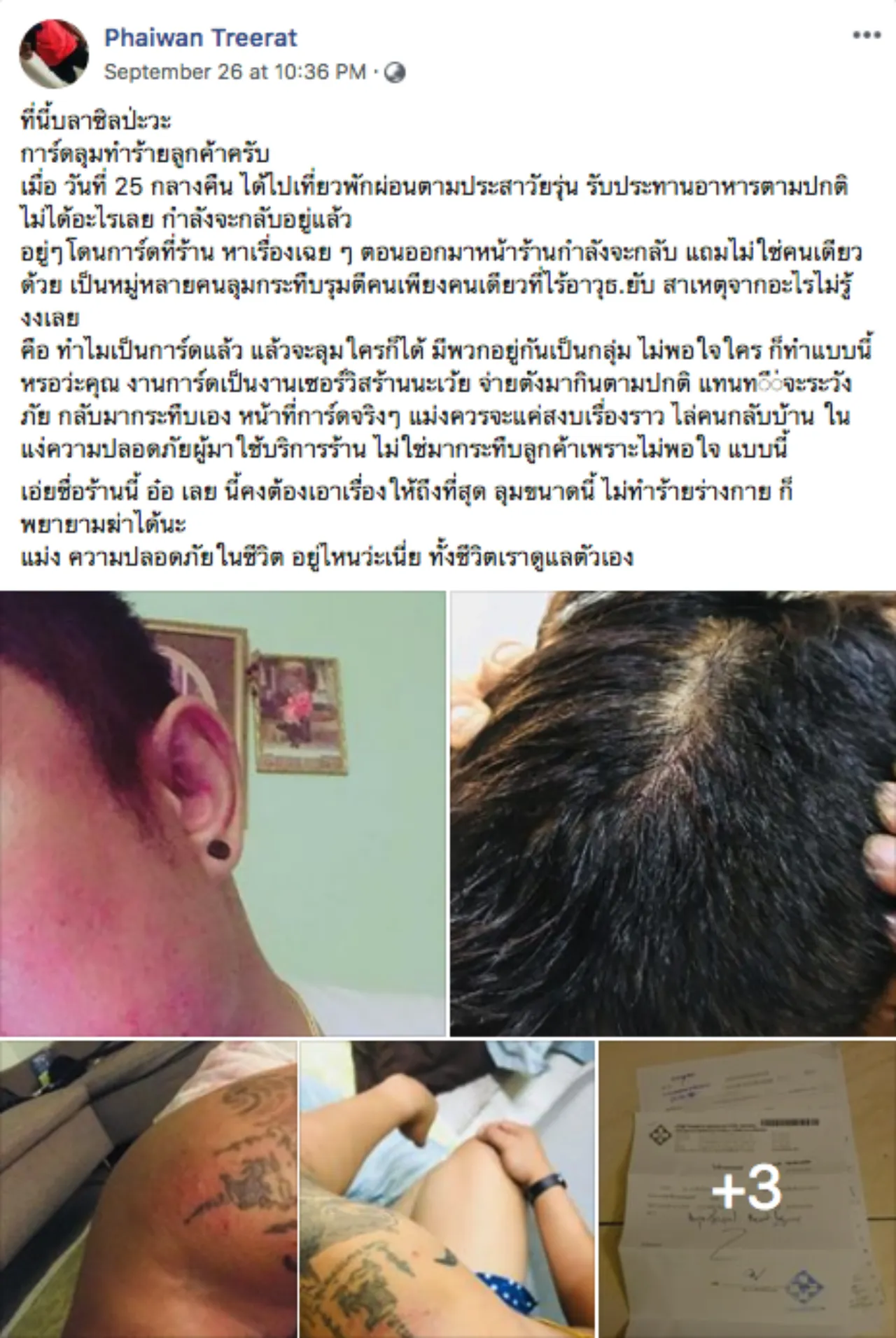 ผู้ใช้เฟซบุ๊ก Phaiwan Treerat โพสต์ภาพบาดแผลที่ได้รับบาดเจ็บ พร้อมโพสต์เล่าเรื่องราวในทำนองว่าถูกทำร้ายขณะกำลังจะกลับจากการดื่มสุราภายในร้านอาหารกึ่งสถานบันเทิงแห่งหนึ่ง โดยเจ้าตัวเล่าว่าคืนวันที่ 25 ก.ย. 61 ที่ผ่านมา ไปเที่ยวและทานอาหารที่ร้านย่านรัตนาธิเบศร์ แต่กลับถูกการ์ดของร้านรุมทำร้ายอย่างไม่มีสาเหตุจนได้รับบาดเจ็บ จากนั้นได้เดินทางไปแจ้งความลงบันทึกประจำวันที่ สภ.รัตนาธิเบศร์ อ.เมืองนนทบุรี