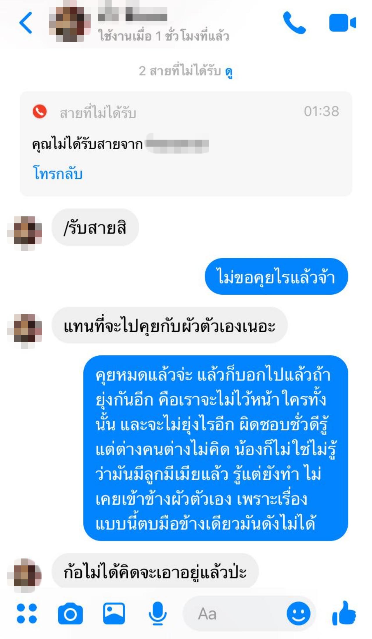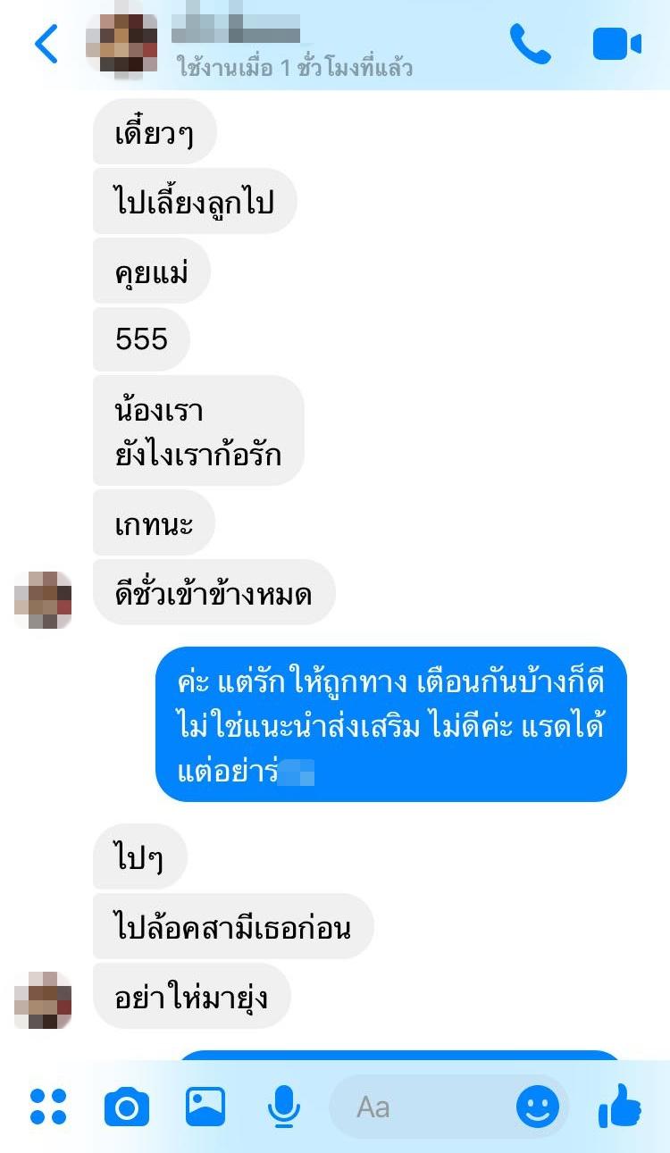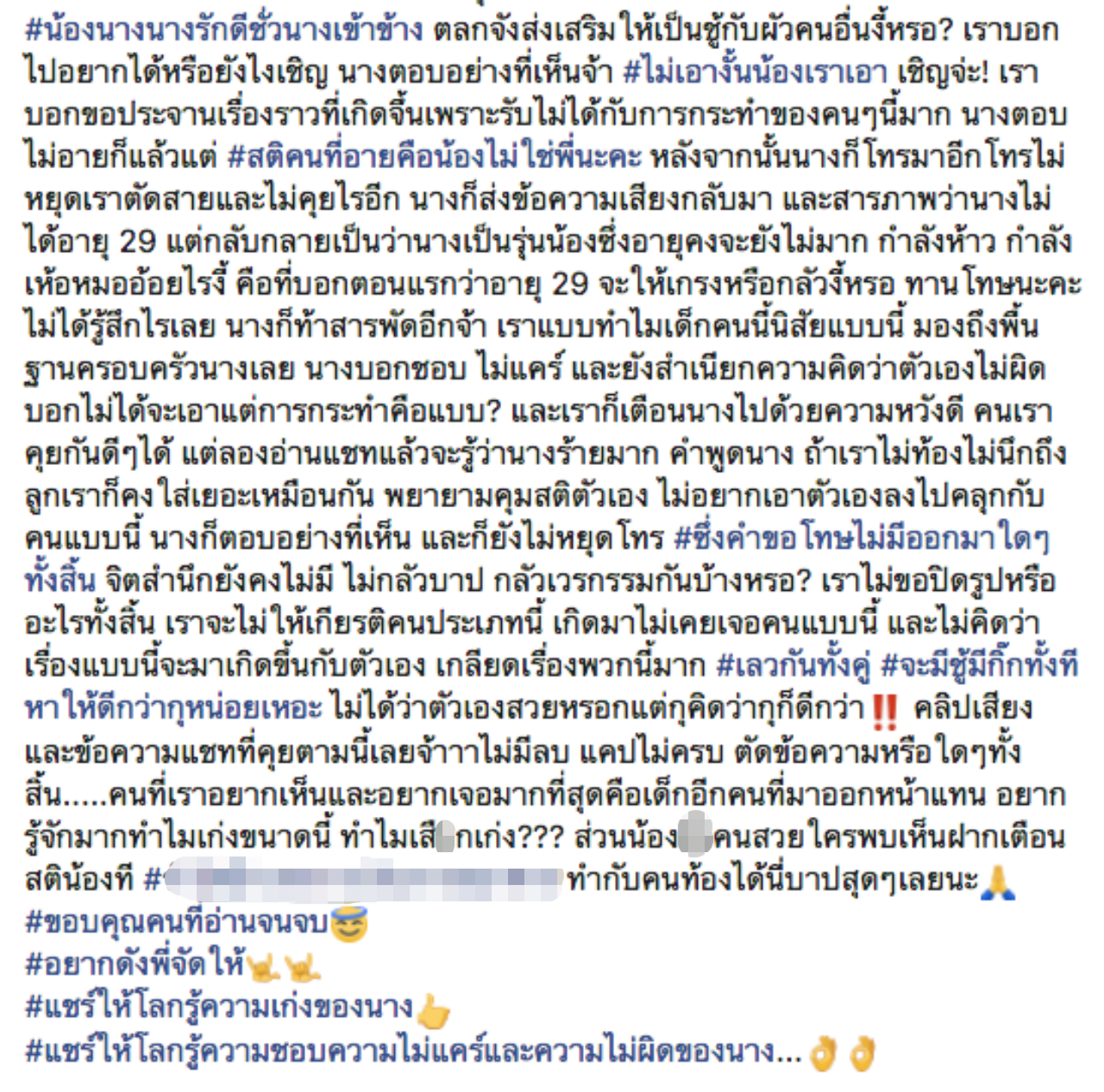 กระทั่งมาถึงคนที่ 3 พยายามพูดดีด้วยทุกอย่าง แม่แฟนเป็นคนโทรคุยเอง ไม่มีคำด่า โดยการเตือนและบอกไปดีๆ ว่าอย่าคุยอย่ายุ่งกันอีก ซึ่งคู่กรณีก็บอกจะเลิกยุ่ง แต่กลับไม่จบแค่นั้น หน้าเฟซบุ๊กของผู้หญิงคนนี้กลับยังโพสต์เพ้อๆ แต่อีกฝ่ายอ้างว่าหมายถึงคนละคน จากนั้นมีหญิงอีกคนที่อ้างว่าเป็นพี่สาวมาเคลียร์ อีกทั้งเจ้าของโพสต์ก็ไม่เข้าข้างแฟนหนุ่มเพราะรู้ว่าตบมือข้างเดียวไม่ดัง