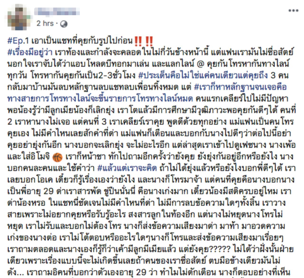 เมื่อวันที่ 5 ต.ค. 61 มีผู้ใช้เฟซบุ๊กรายหนึ่งซึ่งเป็นคุณแม่ใกล้คลอด โพสต์แฉแชตที่ทักไปคุยกับคู่กรณีหลังจับได้ว่าแฟนหนุ่มนอกใจ โดยเจ้าตัวเล่าว่า ตนเองท้องและกำลังจะคลอดในไม่กี่วันข้างหน้านี้ แต่แฟนไม่ซื่อสัตย์ นอกใจ จับได้ว่าคุยกับผู้หญิงอื่นถึง 3 คน แม้ว่ากลับมาบ้านจะลบหลักฐาน ลบแชต ลบเพื่อนทิ้งหมด แต่สุดท้ายเธอก็หาหลักฐานเจอ คนแรกเคลียร์ไปไม่มีปัญหา พอน้องรู้ว่าผู้ชายมีลูกเมียก็เลิกยุ่ง คนที่ 2 ยังหาไม่เจอ