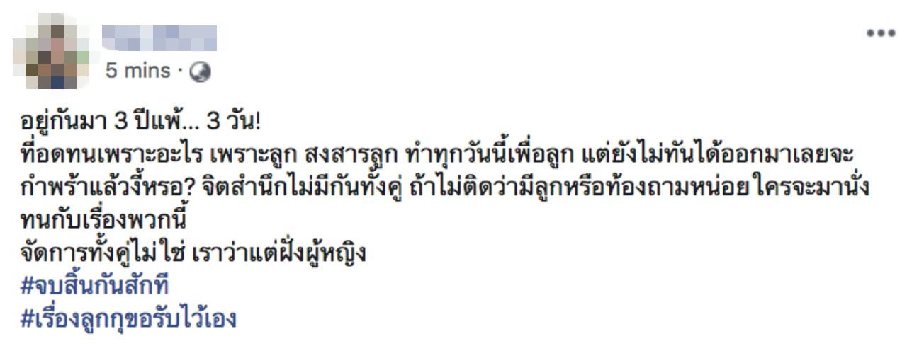 ล่าสุด เจ้าตัวโพสต์ข้อความว่า “อยู่กันมา 3 ปีแพ้... 3 วัน! ที่อดทนเพราะอะไร เพราะลูก สงสารลูก ทำทุกวันนี้เพื่อลูก แต่ยังไม่ทันได้ออกมาเลยจะกำพร้าแล้วงี้หรอ? จิตสำนึกไม่มีกันทั้งคู่ ถ้าไม่ติดว่ามีลูกหรือท้อง ถามหน่อยใครจะมานั่งทนกับเรื่องพวกนี้ จัดการทั้งคู่ ไม่ใช่เราว่าแต่ฝั่งผู้หญิง #จบสิ้นกันสักที #เรื่องลูกขอรับไว้เอง”