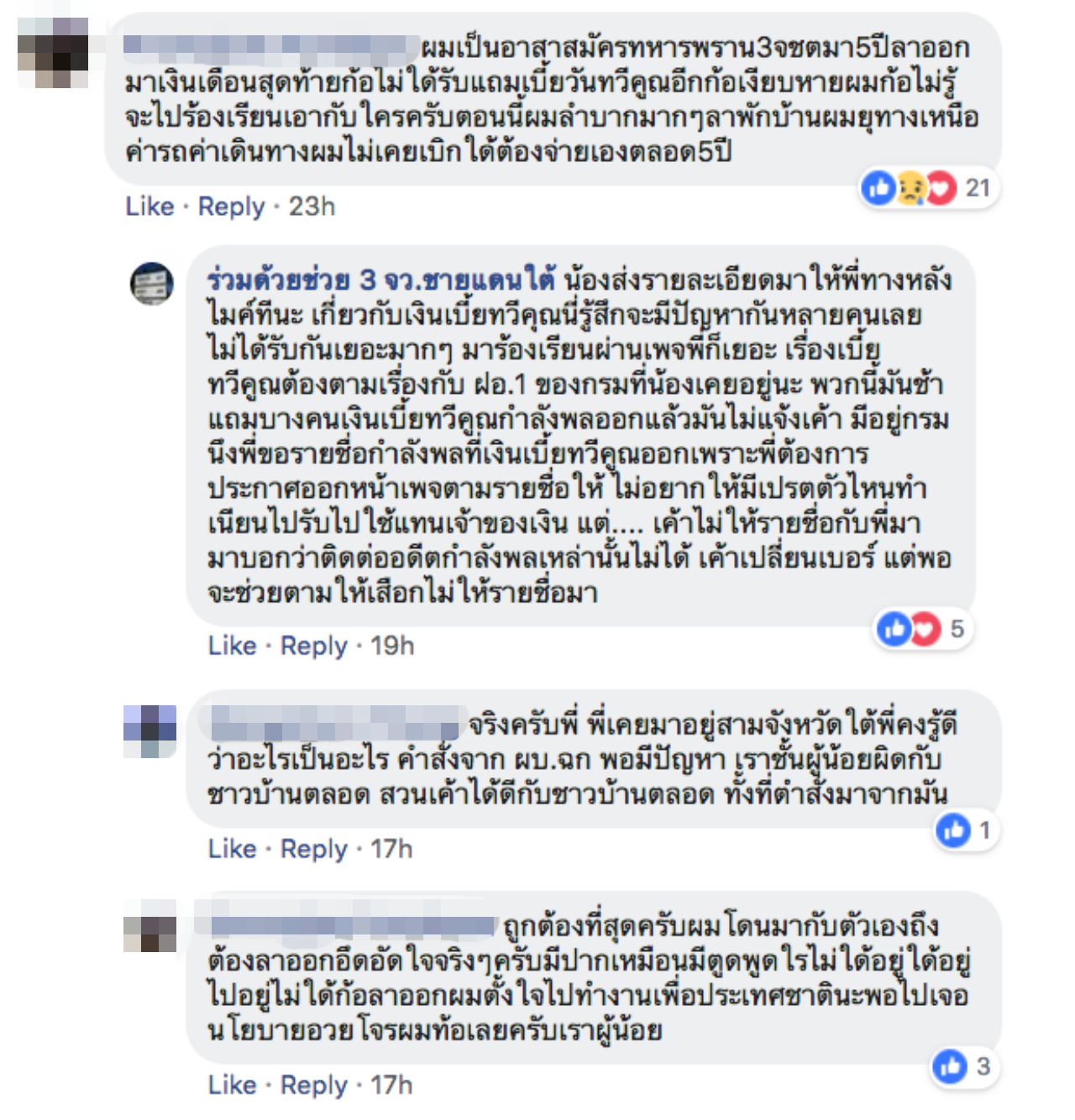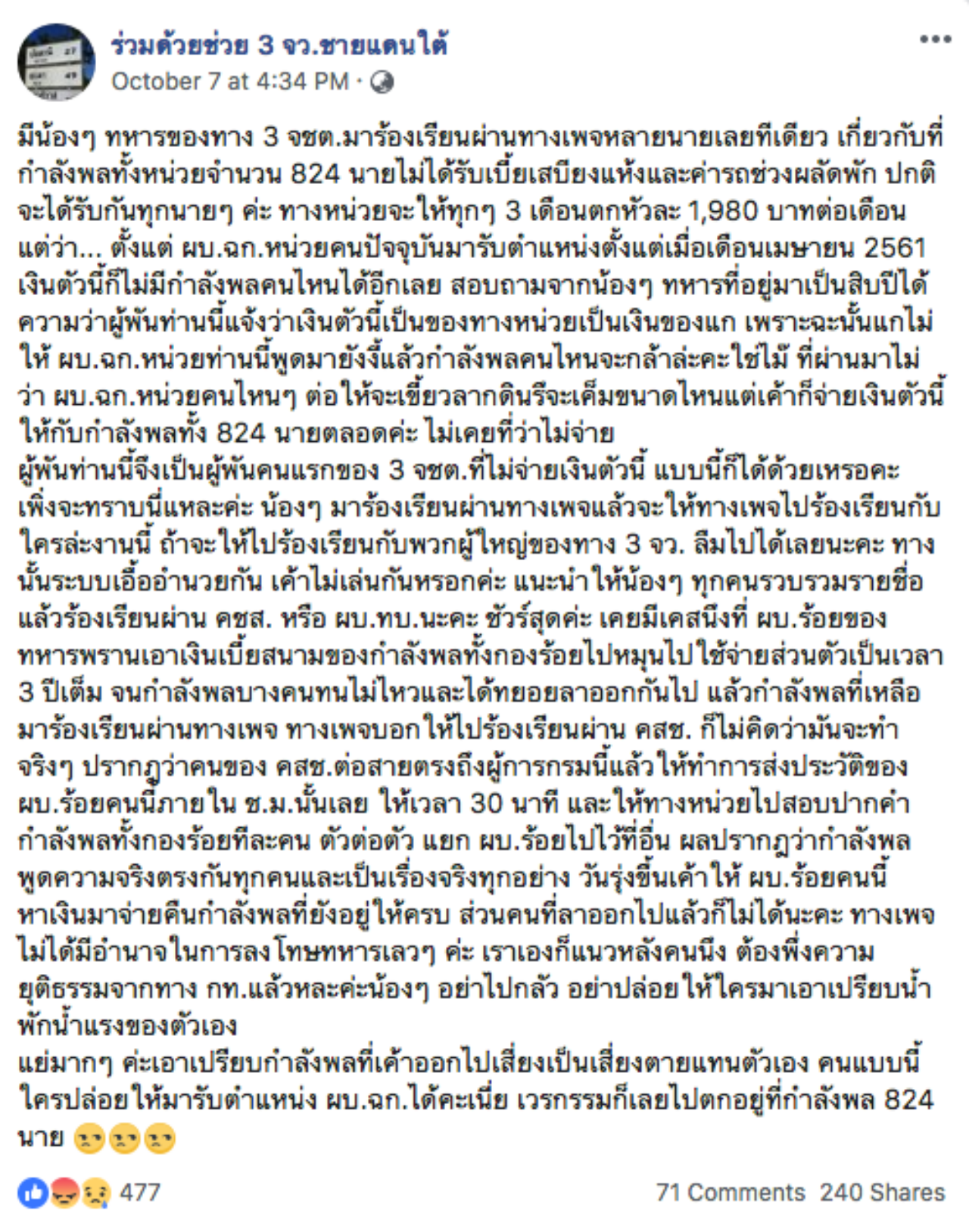 แฟนเพจเฟซบุ๊ก ร่วมด้วยช่วย 3 จว.ชายแดนใต้ โพสต์ข้อความเมื่อวันที่ 7 ต.ค. 61 โดยเนื้อหาอ้างว่า มีทหารของทาง 3 จังหวัดชายแดนภาคใต้ มาร้องเรียนผ่านทางเพจหลายนาย หลังกำลังพลทั้งหน่วยจำนวน 824 นาย ไม่ได้รับเบี้ยเสบียงแห้งและค่ารถช่วงผลัดพัก ปกติจะได้รับกันทุกนายๆ ทางหน่วยจะให้ทุกๆ 3 เดือน ตกหัวละ 1,980 บาทต่อเดือน