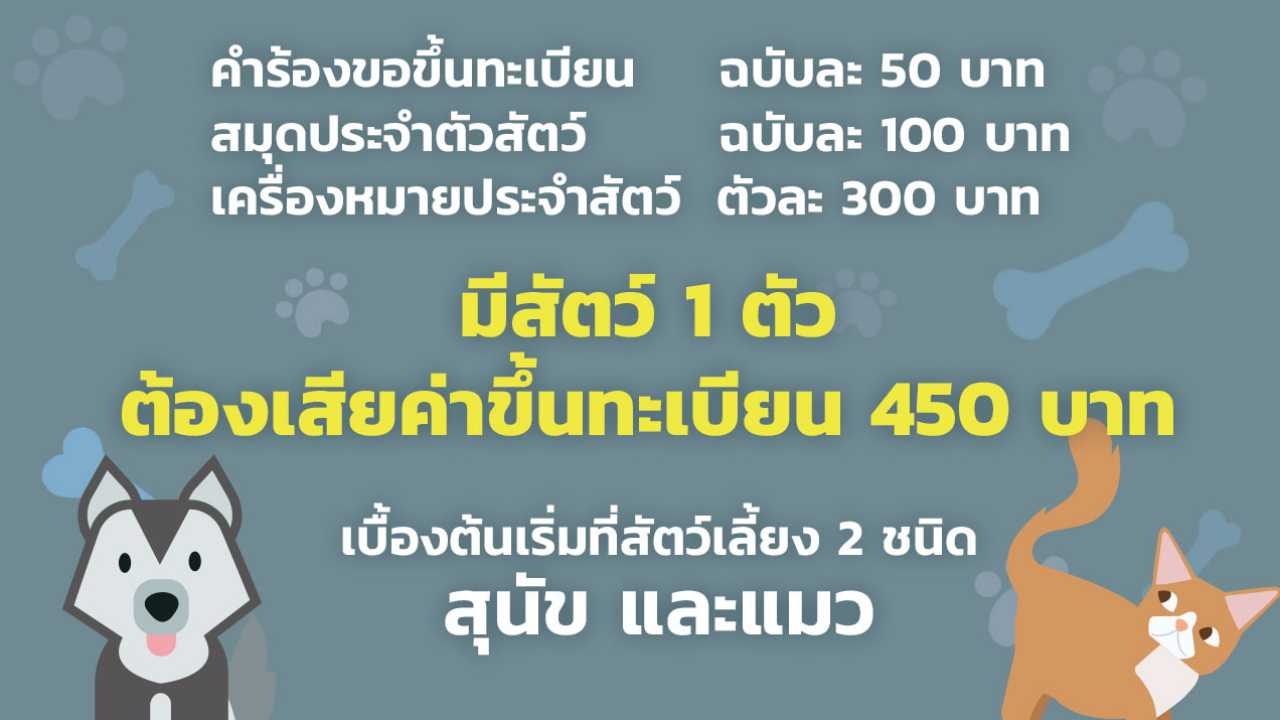 ทั้งนี้ รวมค่าใช้จ่ายการขึ้นทะเบียนสุนัข หรือแมว 1 ตัว ต้องเสียค่าใช้จ่าย 450 บาทต่อตัว แต่ยังไม่มีความชัดเจนว่าจะมีค่าใช้จ่ายรายปี หรืออื่นๆ เพิ่มเติมหรือไม่