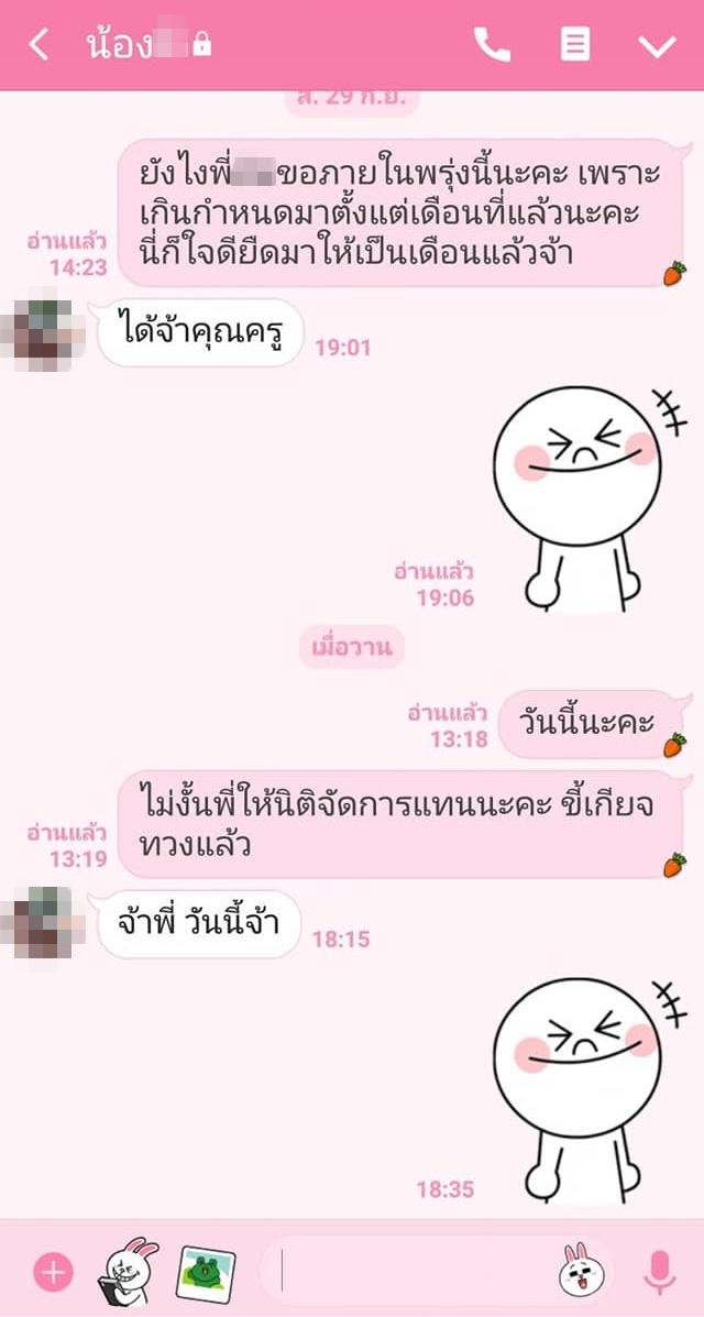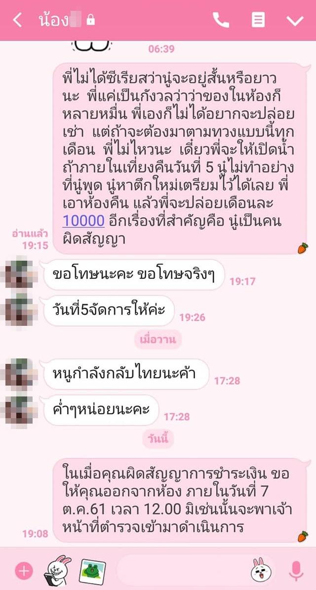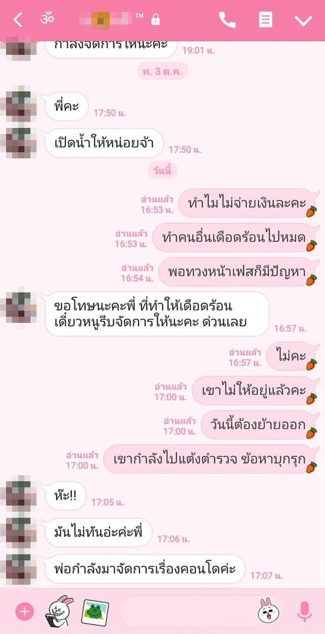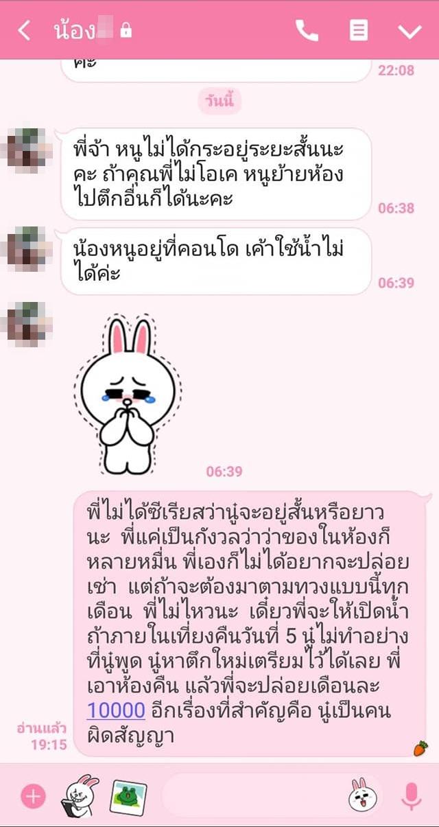 พร้อมกันนี้ ยังได้โพสต์สภาพห้องที่ค่อนข้างรก และข้อความแชตเรื่องการทวงถามค่าต่างๆ ที่ฝ่ายผู้เช่าไม่ยอมจ่ายเงิน จนกระทั่งถูกตัดน้ำตัดไฟด้วย และสุดท้ายแจ้งว่าเจ้าของห้องขอให้ผู้เช่ารายนี้ออกจากห้องภายในเวลา 12.00 น. วันที่ 7 ต.ค. 61 มิเช่นนั้นจะแจ้งความ หลังจากนั้นจึงมาพบกับสภาพห้องเช่นนี้ อย่างไรก็ตาม ผู้โพสต์ได้ลงภาพห้องก่อนที่จะให้คนเช่าในคอมเมนต์ด้วย.