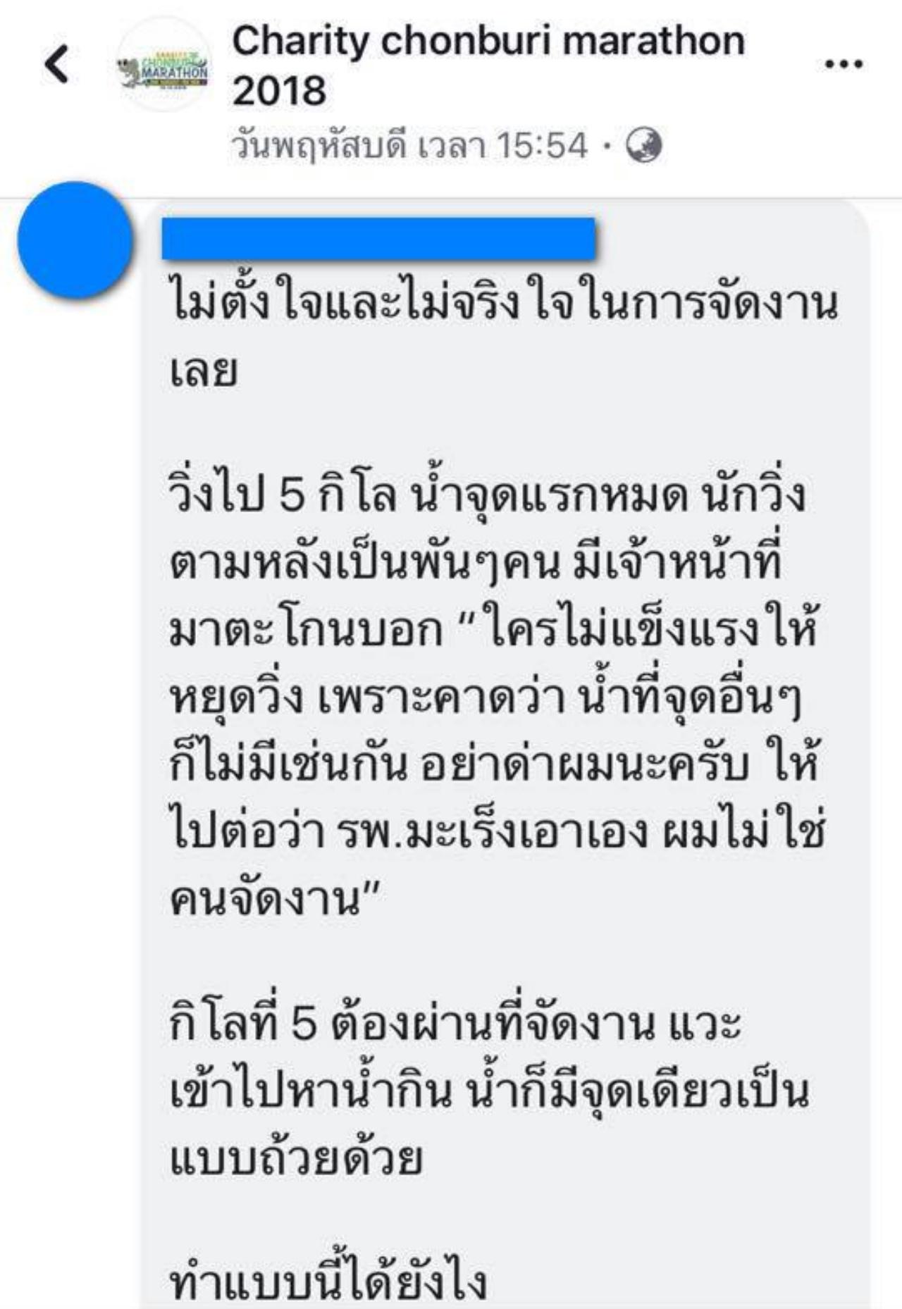 จากกรณีงานวิ่งการกุศล Charity Chonburi marathon 2018 ซึ่งจัดขึ้นในช่วงเช้าวันที่ 14 ต.ค. 61 โดยมีประเภทการแข่งขัน 4 ระยะประกอบด้วย 5 กิโลเมตร / 10.5 กิโลเมตร / 21 กิโลเมตร และ 42.195 กิโลเมตร โดยนักวิ่งที่เข้าร่วมงานส่วนใหญ่ต่างรู้สึกไม่พอใจการจัดงาน รวมถึงเรื่องน้ำดื่มที่มีไม่เพียงพอจนกลายเป็นกระแสอย่างต่อเนื่องในโลกโซเชียลนั้น