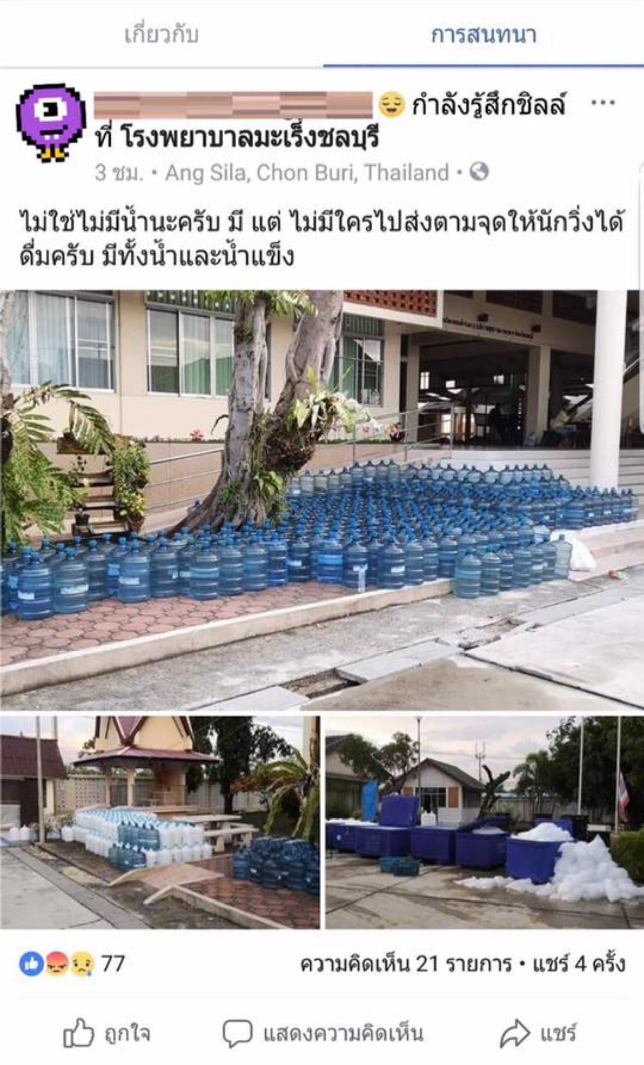 นอกจากนี้ ตามที่เป็นภาพข่าวปรากฏตามสื่อต่างๆ ว่ามีน้ำดื่มถูกจัดเก็บไว้ภายใน รพ.มะเร็งชลบุรี โดยไม่ได้นำออกไปให้นักวิ่งนั้น เป็นความเข้าใจผิดและคลาดเคลื่อนของผู้เผยแพร่ภาพ เนื่องจากภาพดังกล่าวเป็นภาพน้ำดื่มที่จัดเก็บอยู่ภายในหน่วยงานข้างเคียงของ รพ.มะเร็งชลบุรี และมิได้จัดเก็บภายใน รพ.มะเร็งชลบุรี ทั้งนี้ รพ.มะเร็งชลบุรี มิได้มีส่วนเกี่ยวข้องแต่ประการใดในการดำเนินการเกี่ยวกับอาหารและน้ำดื่มในงาน