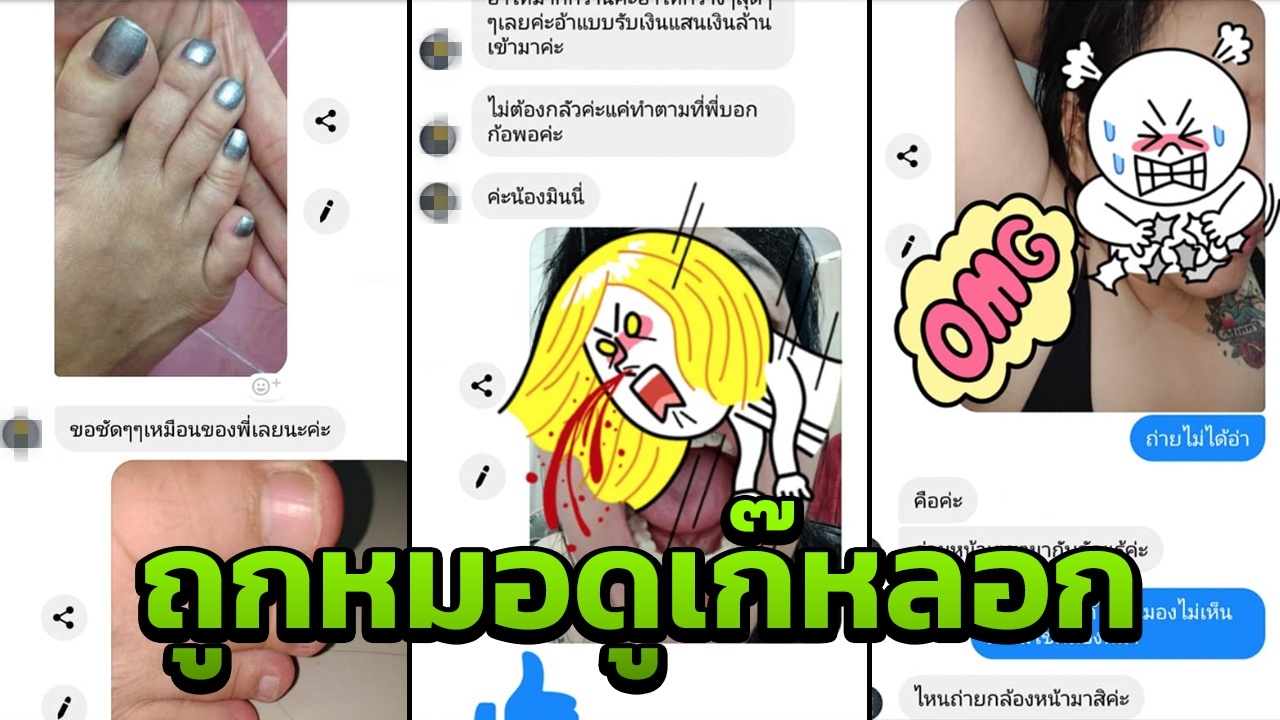 ทำให้เผลอถ่ายอวัยวะส่วนต่างๆ ของร่างกาย ไม่ว่าจะเป็นนิ้วมือ นิ้วเท้า พุง สะดือ ไม่เว้นแม้แต่รักแร้ ทั้งที่เพิ่งไปเล่นฟิตเนสกลับมา เหงื่อท่วมตัว ก็ยังต้องมาถ่ายตรงนั้นตรงนี้ให้ดู ซึ่งใช้เวลาการคุย และการทายตั้งแต่ทุ่มครึ่ง จนถึงเที่ยงคืน สุดท้ายมารู้ว่าถูกหลอก จากนั้นอีกฝ่ายก็บล็อกเฟซบุ๊กไปทันที
