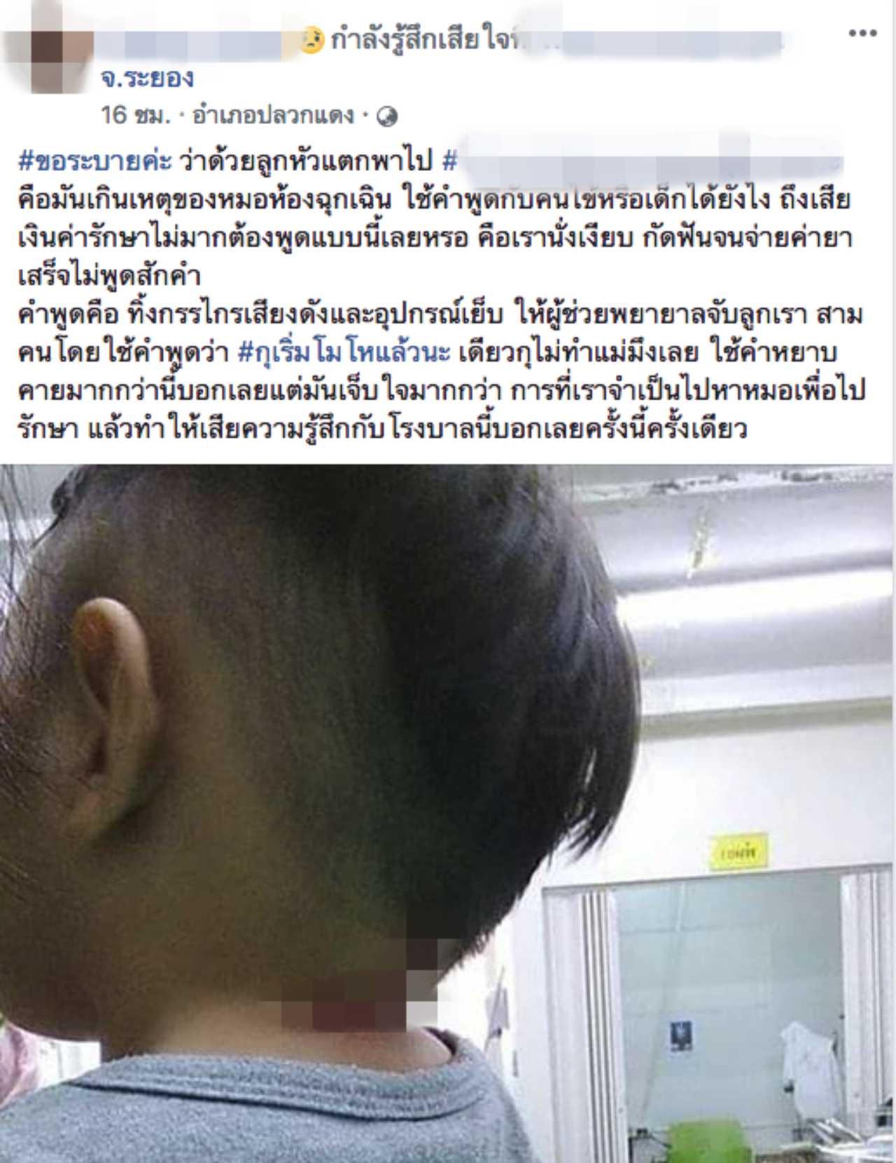ผู้สื่อข่าวรายงานว่า คุณแม่ของเด็กชายคนหนึ่งในจังหวัดระยอง โพสต์ภาพและข้อความผ่านเฟซบุ๊กส่วนตัว โดยระบุว่า #ขอระบายค่ะ ว่าด้วยลูกหัวแตกพาไปโรงพยาบาลแห่งหนึ่งย่านนิคมอุตสาหกรรมปลวกแดง คือ มันเกินเหตุของหมอห้องฉุกเฉิน ใช้คำพูดกับคนไข้หรือเด็กได้ยังไง ถึงเสียเงินค่ารักษาไม่มากต้องพูดแบบนี้เลยเหรอ เราได้แต่นั่งเงียบ กัดฟันจนจ่ายค่ายาเสร็จไม่พูดสักคำ