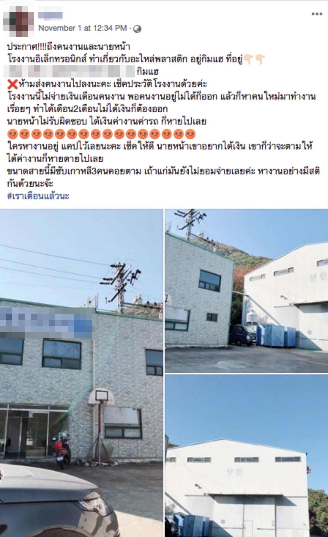 วันที่ 5 พ.ย.61 มีรายงานว่าผู้ใช้เฟซบุ๊กรายหนึ่ง ได้โพสต์ภาพโรงงานแห่งหนึ่งในเกาหลีใต้ และข้อความเตือนภัยว่า ประกาศถึงคนงานและนายหน้า โรงงานอิเล็กทรอนิกส์ ทำเกี่ยวกับอะไหล่พลาสติก อยู่กิมแฮ ห้ามส่งคนงานไปลงนะคะ เช็กประวัติโรงงานด้วยค่ะ โรงงานนี้ไม่จ่ายเงินเดือนคนงาน พอคนงานอยู่ไม่ได้ก็ออก แล้วก็หาคนใหม่มาทำงานเรื่อยๆ ทำได้เดือน 2 เดือนไม่ได้เงินก็ต้องออก นายหน้าไม่รับผิดชอบ ได้เงินค่างานค่ารถ ก็หายไปเลย