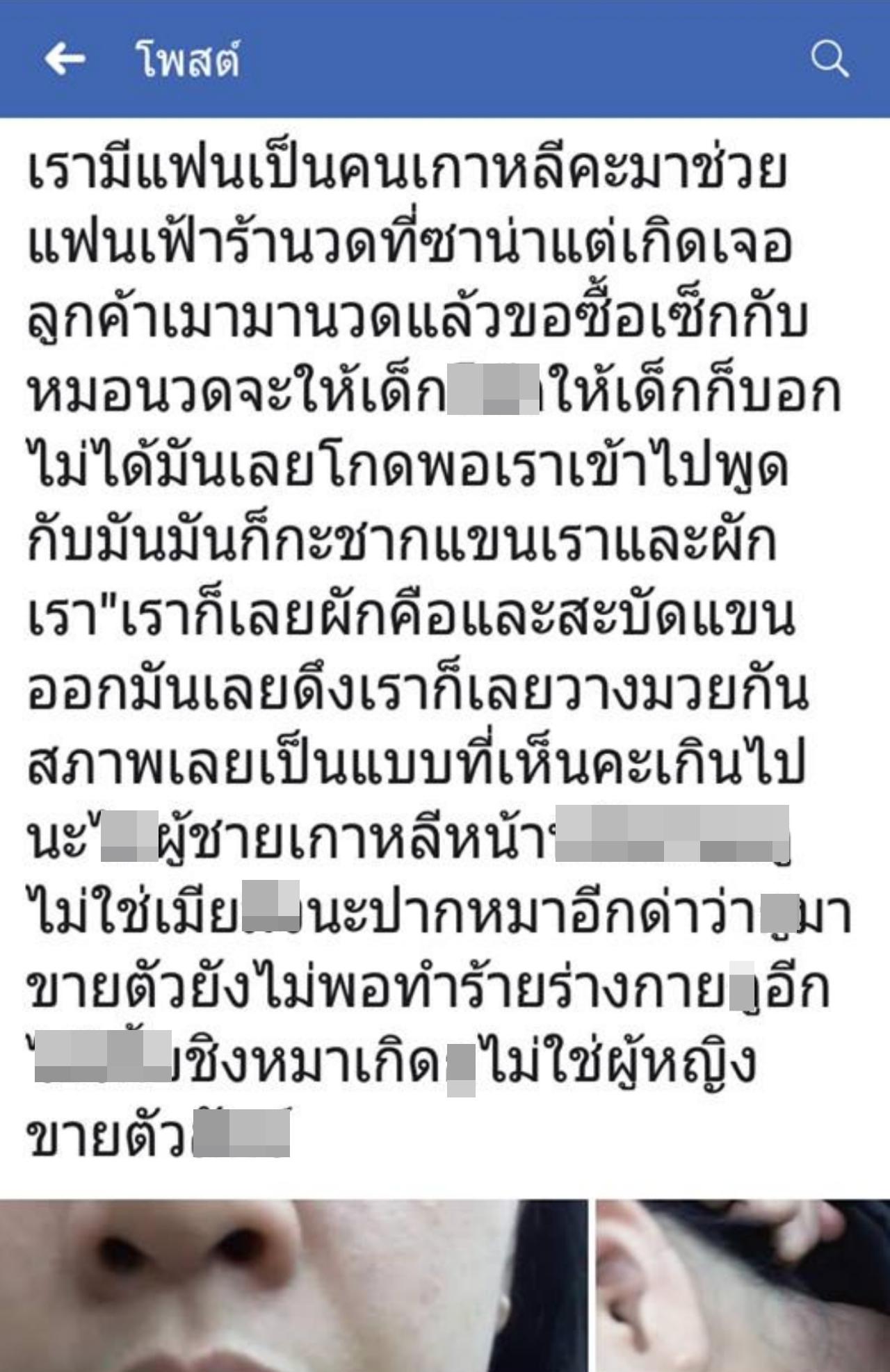 วันที่ 8 พ.ย.61 มีรายงานว่า เฟซบุ๊กของผู้หญิงคนหนึ่งที่ทำงานอยู่ที่ประเทศเกาหลีใต้ ได้โพสต์เตือนภัยว่า ตนเองมีแฟนเป็นคนเกาหลี แล้วมาช่วยแฟนเฝ้าร้าน แต่เกิดเจอลูกค้าเมาพยายามขอมีอะไรกับหมอนวดในร้าน ซึ่งหมอนวด ซึ่งเป็นเด็กในร้านไม่ยินยอม เมื่อตนเข้าไปช่วยพูดก็ถูกลูกค้าคนดังกล่าวกระชากแขนทำร้ายร่างกายไปด้วย