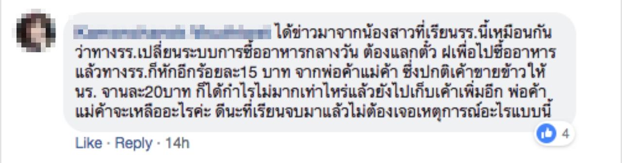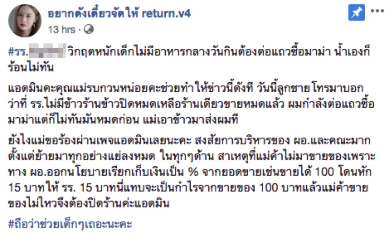 เพจเฟซบุ๊ก อยากดังเดี๋ยวจัดให้ return.v4 ได้โพสต์ภาพเด็กนักเรียนของโรงเรียนแห่งหนึ่งกำลังรอต่อแถวซื้ออาหารกลางวัน โดยระบุข้อความว่า มีผู้ปกครองของเด็กโรงเรียนแห่งนี้ส่งเรื่องเข้ามาร้องเรียนว่า ลูกชายโทรมาบอกให้เอาข้าวไปส่งเพราะโรงเรียนไม่มีร้านข้าว เหลือเปิดเพียงร้านเดียวและขายหมดแล้ว เด็กๆ จึงไปต่อแถวซื้อบะหมี่กึ่งสำเร็จรูปแต่ก็มีไม่เพียงพอ และน้ำก็ร้อนไม่ทัน