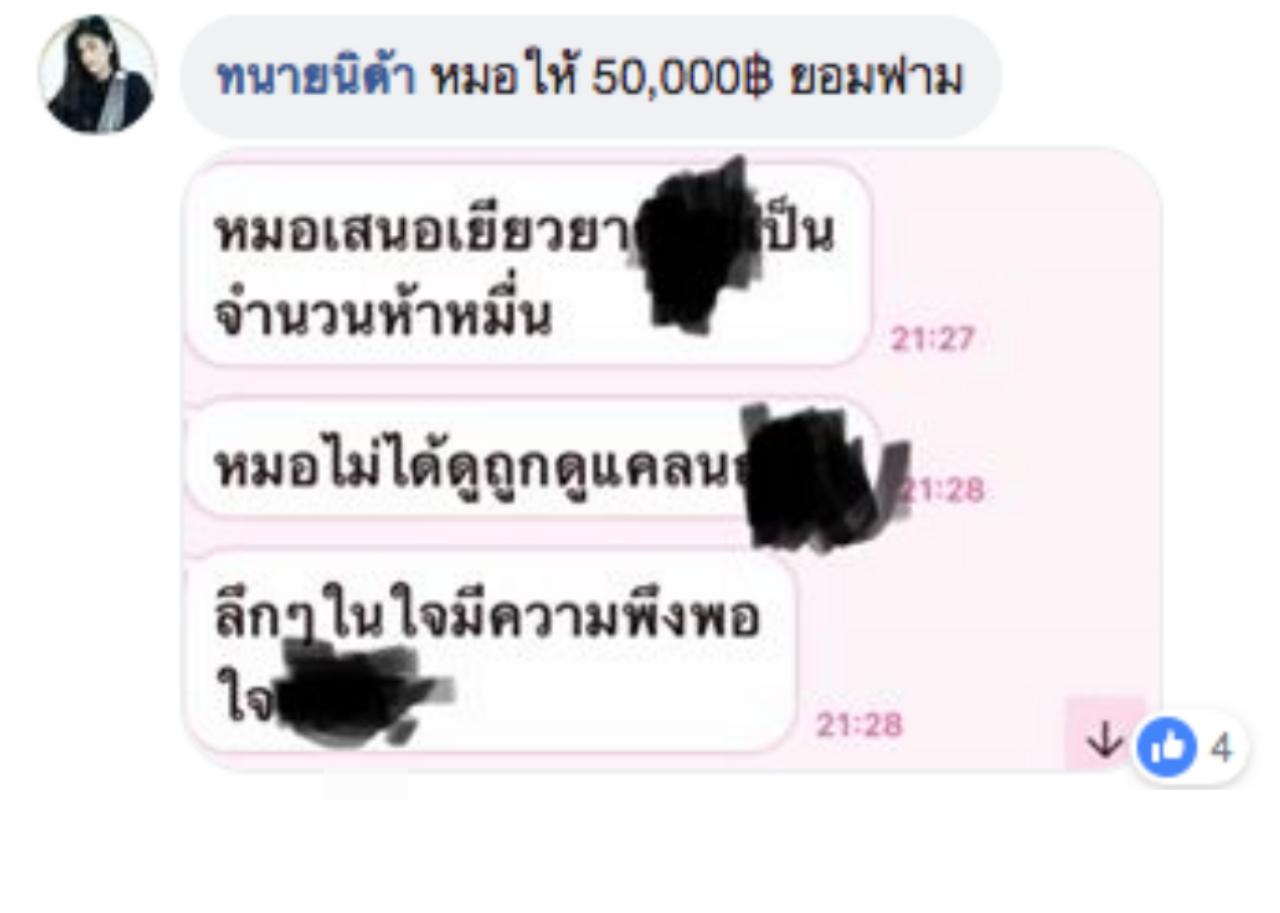 นอกจากนี้ แพทย์คนดังกล่าวยังบอกอีกว่า เสนอเงินเยียวยาจำนวน 50,000 บาท เพื่อยอมความ ซึ่งเงินจำนวนนี้ไม่ได้ให้เพราะดูถูก และลึกๆในใจมีความพึงพอใจ