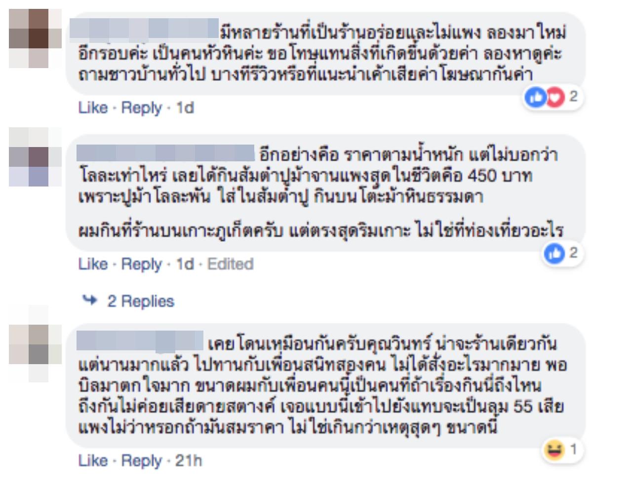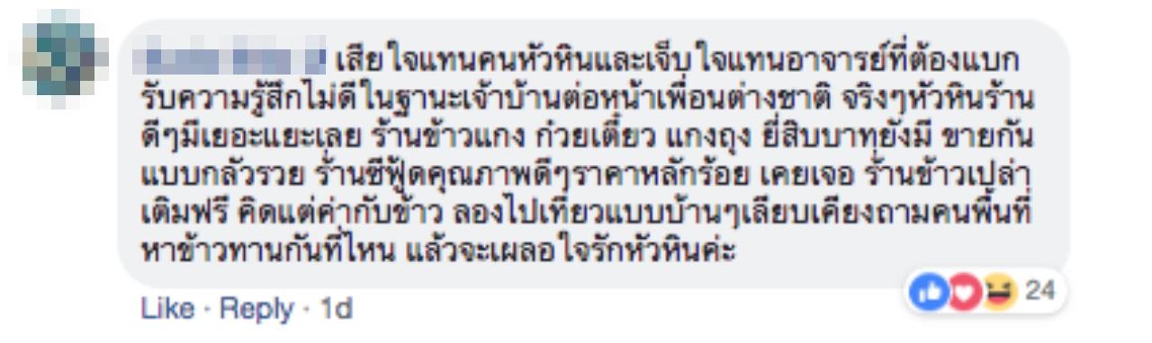 ขณะที่บางส่วนระบุว่า ร้านอาหารราคาไม่แพงในหัวหินมีหลายร้าน เห็นข่าวนี้แล้วรู้สึกเสียใจแทนคนหัวหิน จริงๆ หัวหินร้านดีๆ มีเยอะแยะเลย ร้านข้าวแกง ก๋วยเตี๋ยว แกงถุง ยี่สิบบาท ยังมี ขายกันแบบกลัวรวย ร้านซีฟู้ด คุณภาพดีๆ ราคาหลักร้อย เคยเจอ ร้านข้าวเปล่าเติมฟรี คิดแต่ค่ากับข้าว ลองไปเที่ยวแบบบ้านๆ เลียบเคียงถามคนพื้นที่ หาข้าวทานกันที่ไหน แล้วจะเผลอใจรักหัวหิน เป็นต้น