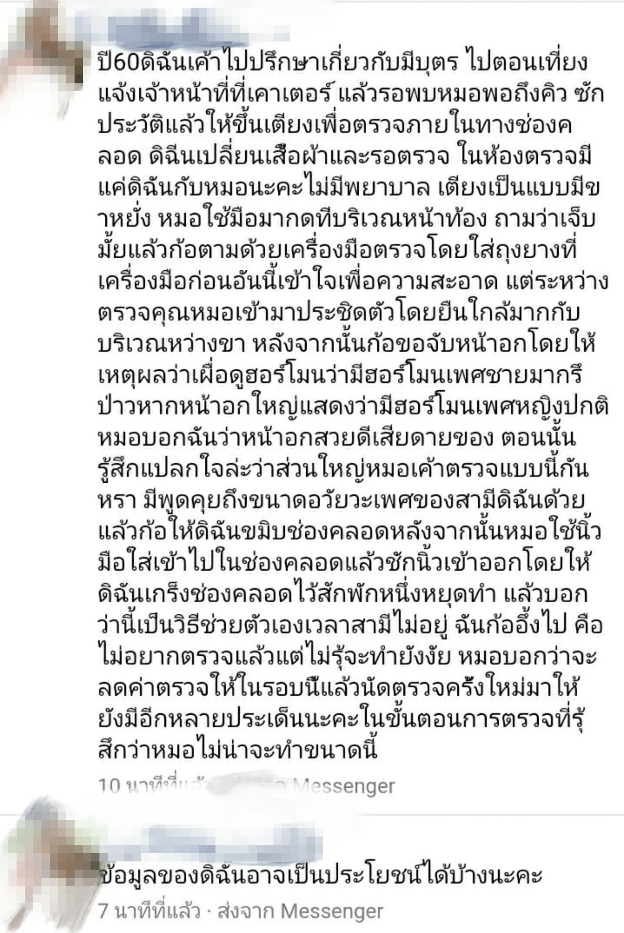 แต่ระหว่างตรวจมีการเข้าประชิดตัวรวมถึงการขอจับหน้าอก โดยอ้างว่าเพื่อดูฮอร์โมน ก่อนจะพูดว่า “หน้าอกสวยดี เสียดายของ” ทำให้เริ่มรู้สึกแปลกใจ อีกทั้งมีการพูดถึงขนาดอวัยวะเพศของสามีด้วย จากนั้นใช้นิ้วสอดเข้าช่องคลอดในลักษณะเข้าและออกก่อนจะพูดว่า “นี่เป็นวิธีช่วยตัวเองเวลาสามีไม่อยู่” ตอนนั้นรู้สึกอึ้งและไม่อยากตรวจแล้ว ก่อนกลับหมอยังบอกอีกว่าจะลดค่าตรวจให้ แล้วนัดมาตรวจครั้งใหม่ พร้อมทั้งหวังว่าเรื่องราวของเธอจะเป็นประโยชน์ได้บ้าง