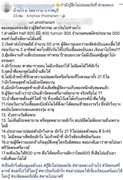 ผู้ใช้เฟซบุ๊กรายหนึ่ง ได้โพสต์ข้อความเกี่ยวกับงานวิ่งหนึ่งที่อ.โพธาราม จ.ราชบุรี โดยเขาได้ตั้งข้อสังเกตระบุว่า ขอเหตุผลที่สงสัยว่าผู้จัดกิจกรรม เอาเงินไปทำอะไร