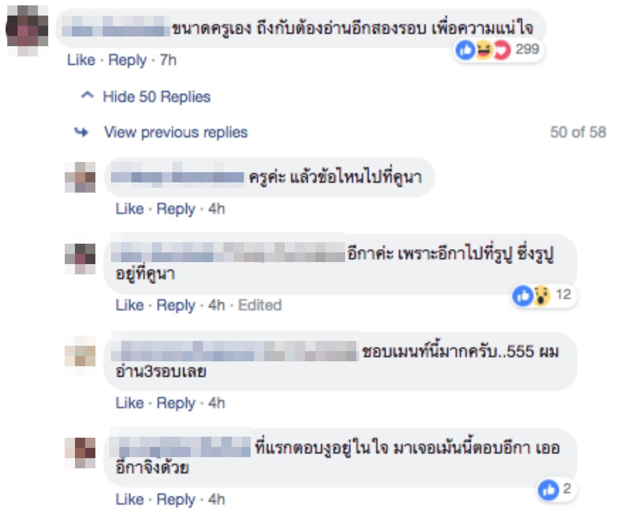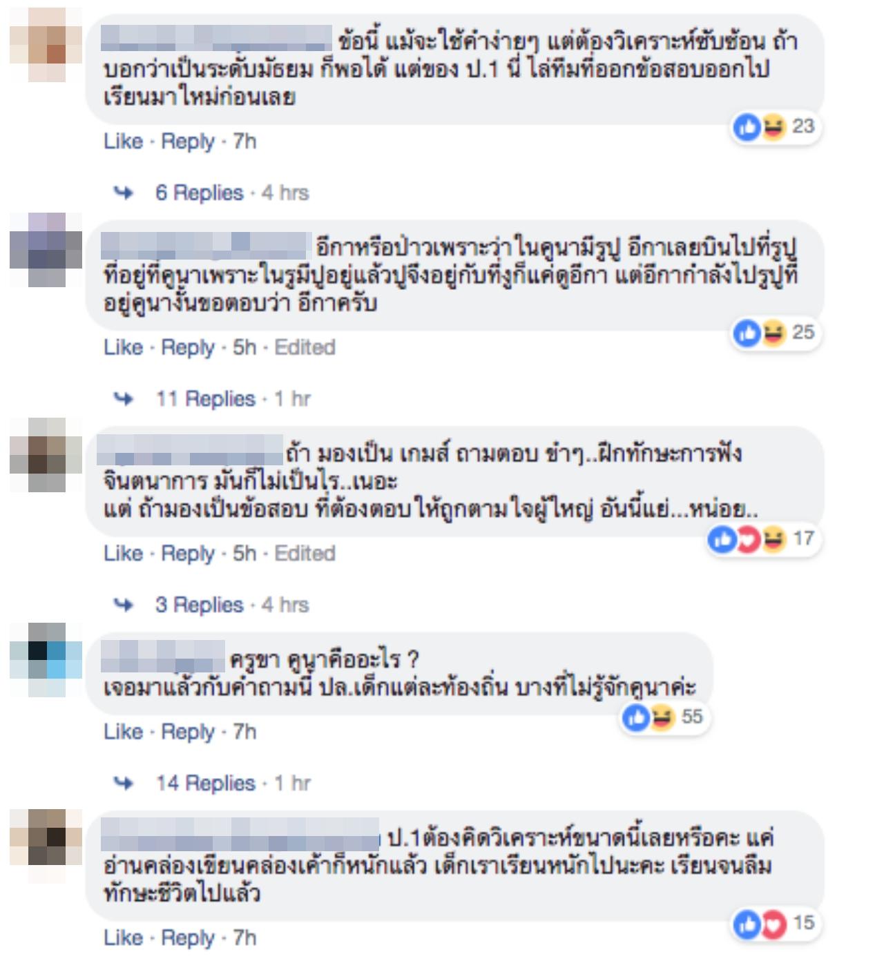 ทั้งนี้ในเวลาต่อมา ได้มีคนเข้ามาถกเถียงกันมากมาย โดยส่วนใหญ่ระบุว่า เป็นคำถามที่ซับซ้อนไปสำหรับเด็ก ป.1 ซึ่งในเวลาต่อมาได้มีครูคนหนึ่งเข้ามาแสดงความคิดเห็นว่า ขนาดครูเอง ถึงกับต้องอ่านอีกสองรอบ เพื่อความแน่ใจ พร้อมกับเฉลยว่า คำตอบที่ถูกต้องคือ "อีกา"