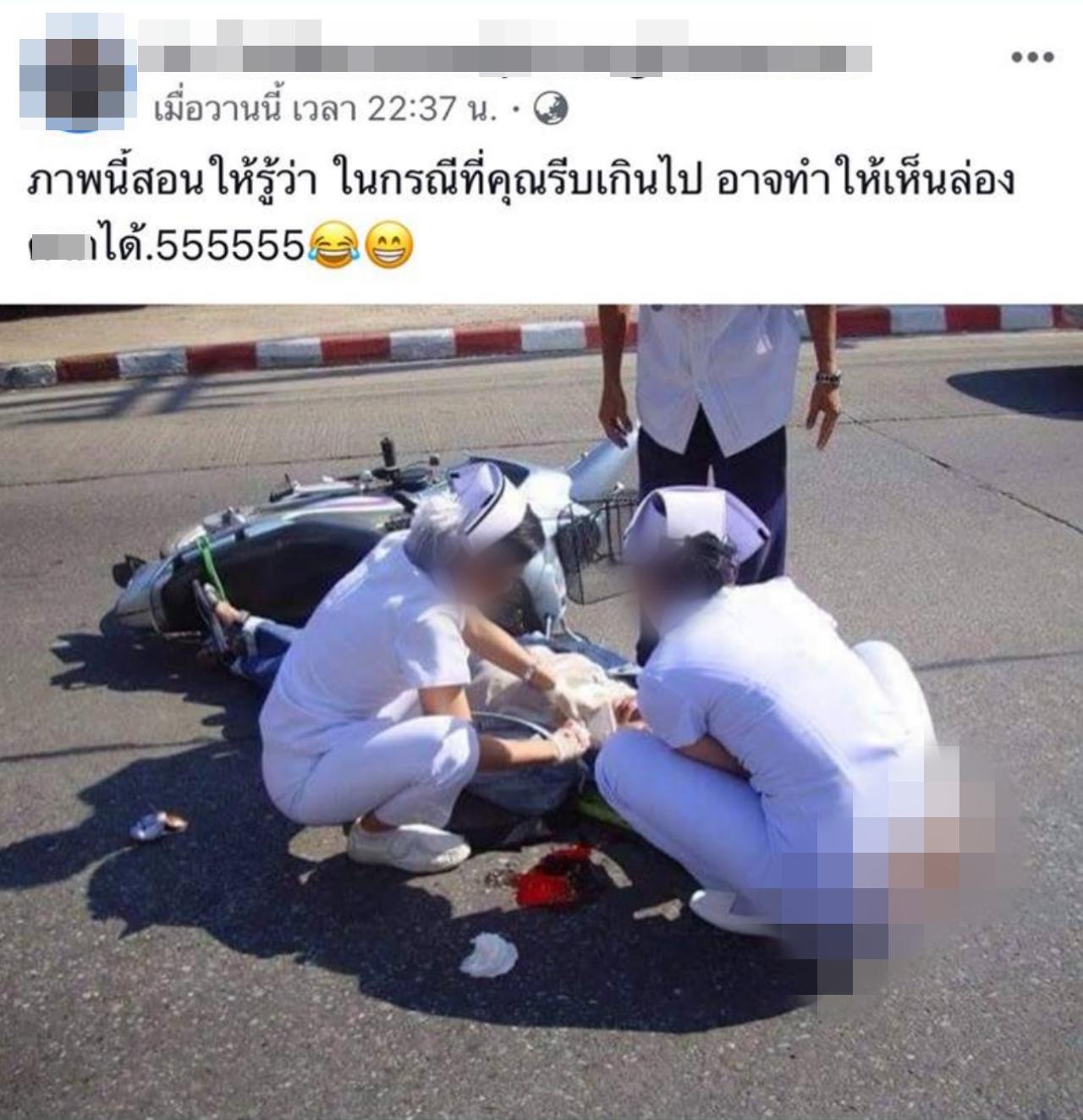 วันที่ 21 พ.ย.61 แฟนเพจ Red Skull ได้วิพากษ์วิจารณ์พฤติกรรมของพลทหารรายหนึ่ง ที่ได้โพสต์ภาพพยาบาล 2 คนกำลังช่วยเหลือผู้ได้รับบาดเจ็บจากอุบัติเหตุอย่างขะมักเขม้น จนทำให้ขอบกางเกงด้านหลังรั้งต่ำลง โดยเขียนแคปชั่นว่า "ภาพนี้สอนให้รู้ว่า ในกรณีที่คุณรีบเกินไป อาจทำให้เห็นร่อง_ได้.555555" ทำให้มีคนเข้ามาคอมเมนต์แซวกันอย่างสนุกปาก