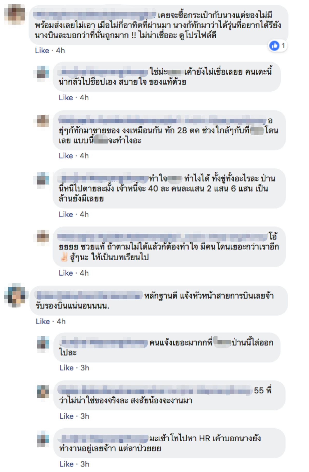 ขณะที่ตรวจสอบไปยังเฟซบุ๊กที่ถูกกล่าวอ้างว่าเป็นสจ๊วต พบว่ามีการโพสต์ขายกระเป๋าและเครื่องประดับจริง โดยล่าสุดคือวันที่ 10 พ.ย.ที่ผ่านมา อย่างไรก็ตาม ผู้โพสต์ได้แสดงความคิดเห็นโต้ตอบคนในคอมเมนต์ด้วยว่า ขณะนี้มีผู้เสียหายเกือบ 40 คนแล้ว.