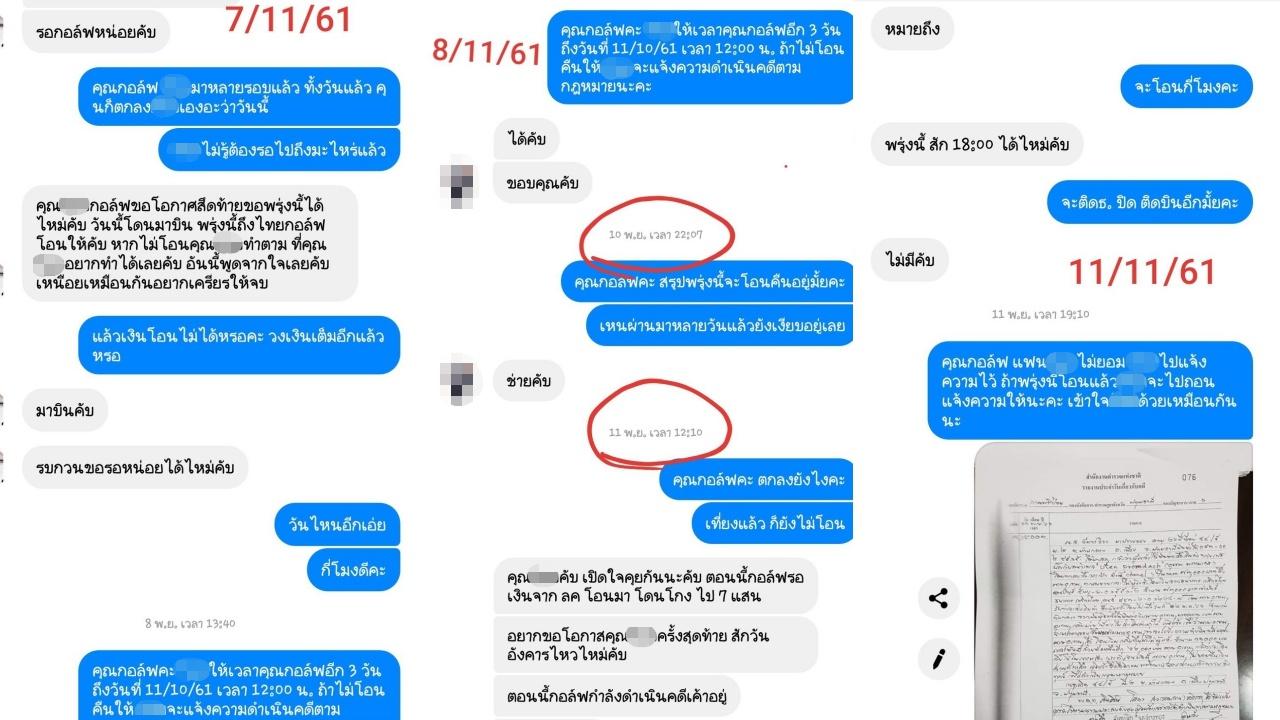 ทั้งนี้ ผู้โพสต์บอกด้วยว่า เรื่องที่เกิดขึ้นไม่ได้โทษใคร เพราะเกิดจากความไม่ตรวจสอบข้อมูลให้ถี่ถ้วนของตัวเอง เพราะความเชื่อใจล้วนๆ เพียงแต่ต้องการเตือนว่า “อย่าเห็นแต่ว่าของถูกกว่าที่อื่น หรือแม้แต่มีหน้าที่การงานดี เพราะมันไม่ได้การันตีว่าจะเป็นคนดีด้วยเลย มันเป็นพวกโจรในคราบคนดีเท่านั้น” และล่าสุดผู้เสียหายก็มีการแจ้งความลงบันทึกประจำวันแล้ว ซึ่งจากข้อความแชตฝ่ายสจ๊วตมีการบ่ายเบี่ยงเรื่อยมา รวมทั้งอ้างว่าถูกโกงไป 700,000 บาทด้วย