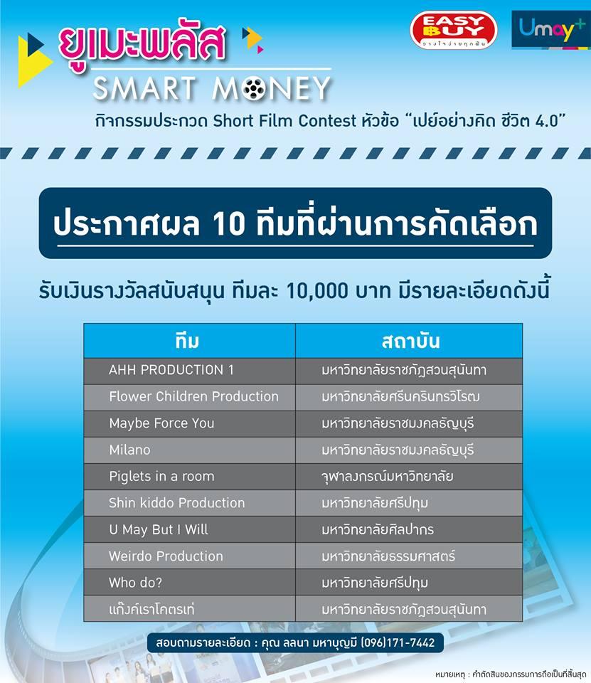 "ยูเมะพลัส"ประกาศรายชื่อผู้ผ่านเข้ารอบ 10 ทีมสุดท้ายจากการประกวดหนังสั้น หัวข้อ "เปย์อย่างคิด ชีวิต 4.0" ในกิจกรรม Umay+ "SMART MONEY" เพื่อให้เยาวชนไทยใช้จ่ายอย่างชาญฉลาด พร้อมสนับสนุนงบประมาณในการผลิตผลงาน ทีมละ 10,000 บาท เพื่อเดินหน้าเฟ้นหาสุดยอดผลงานทรงคุณค่าแห่งปี ซึ่งรอบสุดท้ายนี้ผู้เข้าแข่งขันจะต้องนำไอเดียที่ผ่านเข้ารอบมาจัดทำหนังสั้นความยาวไม่เกิน 3 นาที โดยรอบตัดสินจะจัดขึ้นในวันที่ 28 พ.ย. มหาวิทยาลัยศรีปทุม