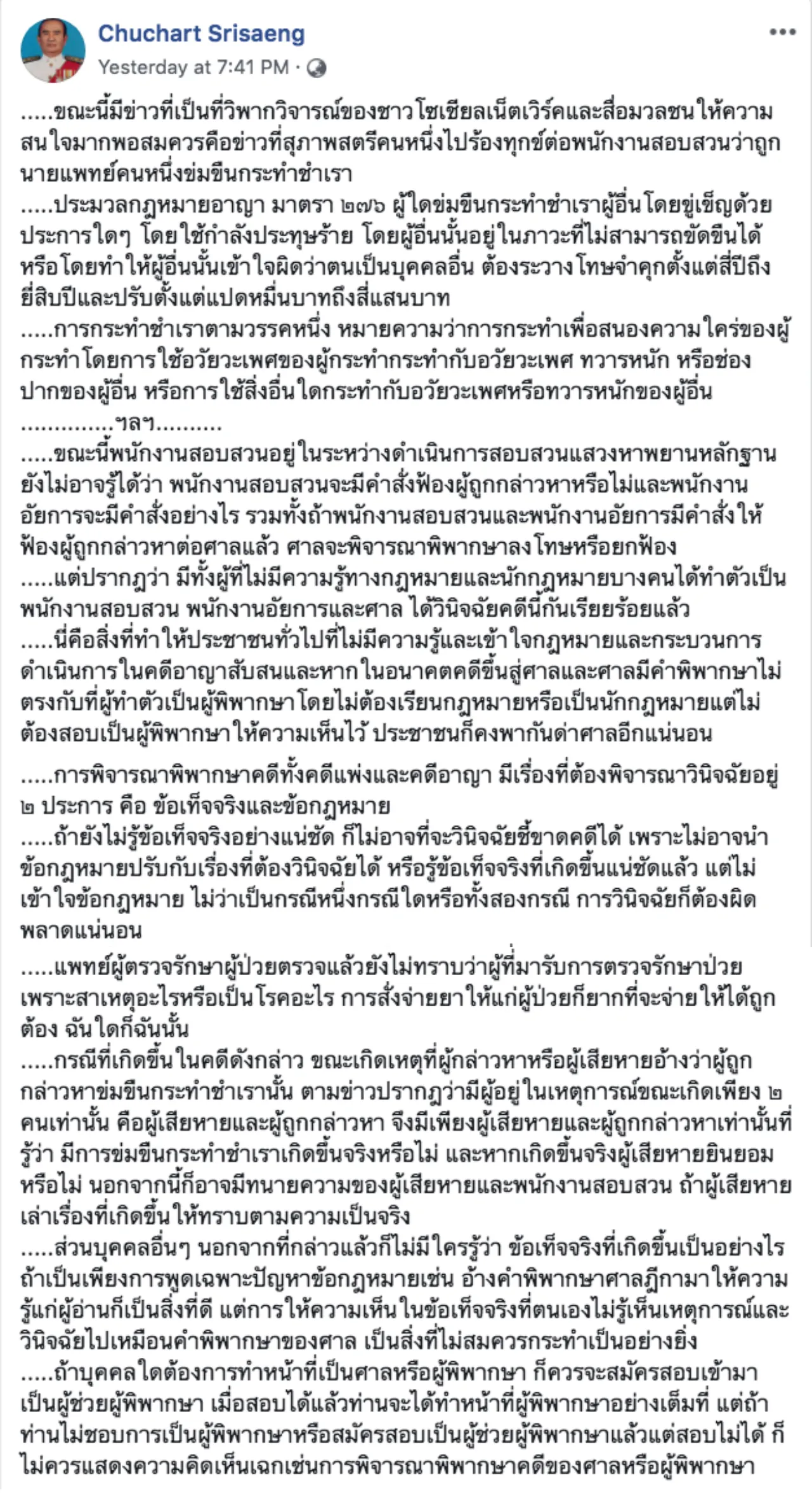 เมื่อวันที่ 21 พ.ย. 61 ที่ผ่านมา ผู้สื่อข่าวรายงานว่า นายชูชาติ ศรีแสง อดีตผู้พิพากษาศาลฎีกา ได้โพสต์ข้อความผ่านเฟซบุ๊กถึงกรณีกระแสข่าวที่สูตินรีแพทย์ หรือหมอสูติฯ ถูกกล่าวหาว่ามีการข่มขืนกระทำชำเราคนไข้