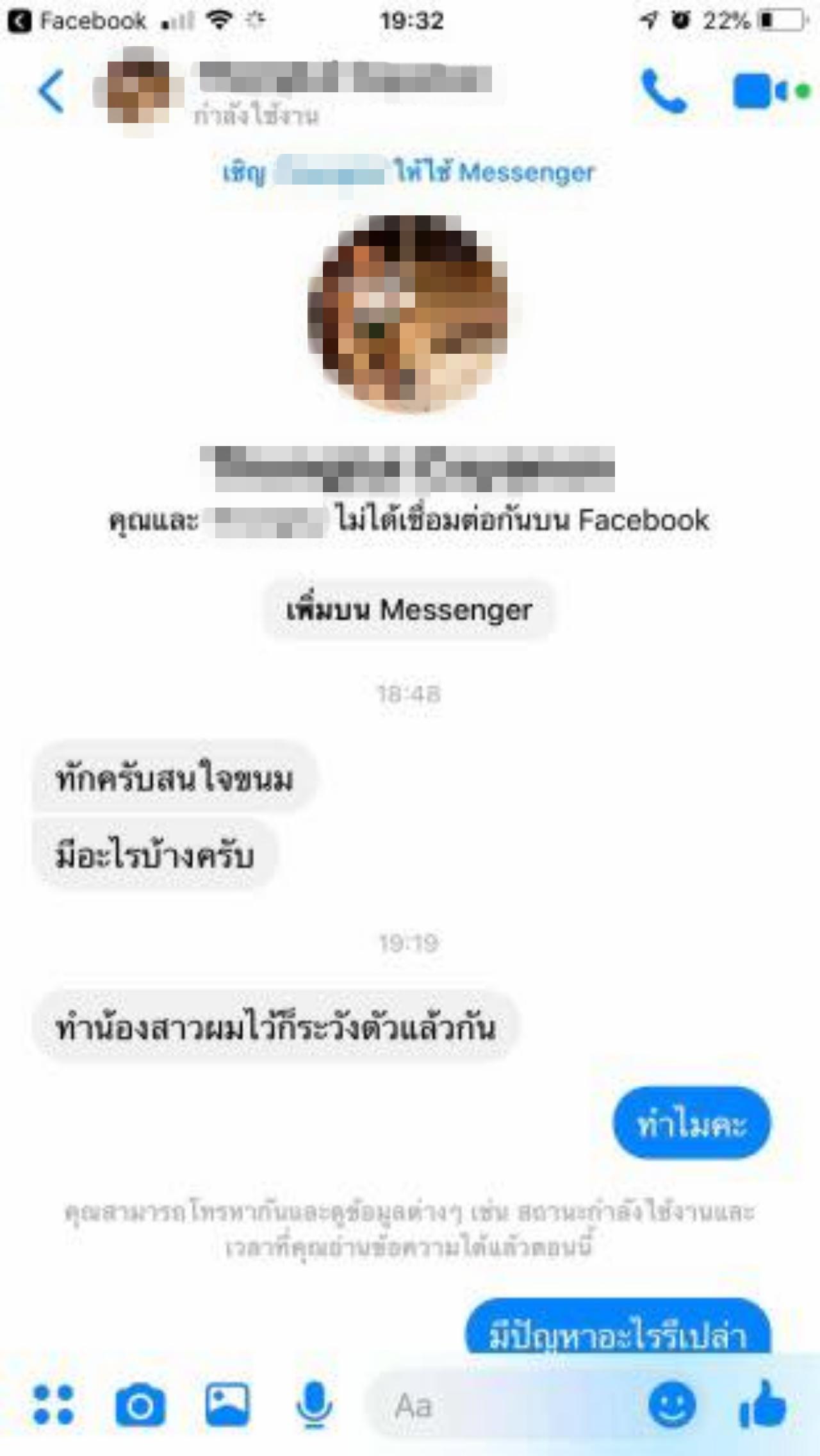แม่ค้าขนมร้องผ่านเพจ Red Skull หลังถูกชายที่ไม่เคยรู้จักกันส่งข้อความในลักษณะข่มขู่ อ้างว่าทำให้น้องเสียลูกค้า หนำซ้ำบอกมีเพื่อนเป็นตำรวจ