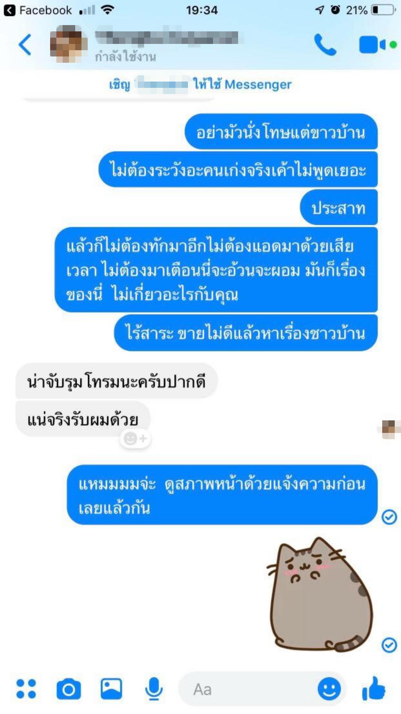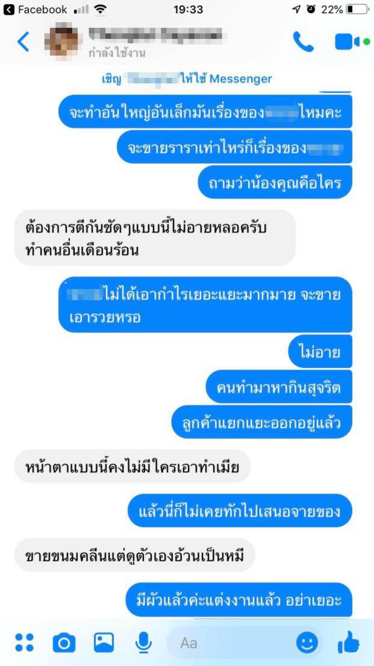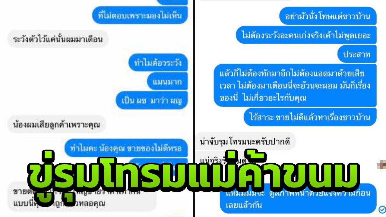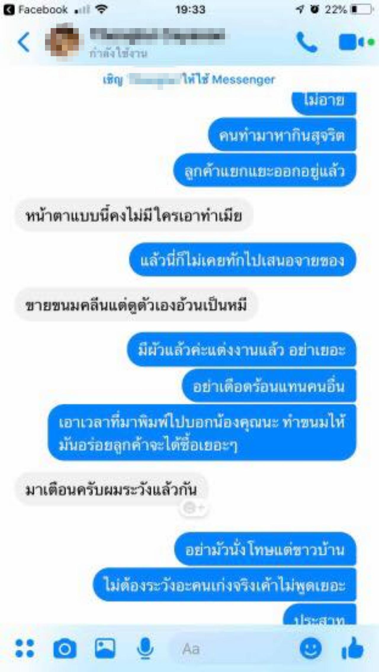 จากข้อความที่โต้ตอบกันโดยฝ่ายชายบอกว่าเข้ามาเตือนแม่ค้าคนนี้ระวังตัว เนื่องจากทำขนมชิ้นใหญ่กว่าแต่ขายในราคาเท่ากัน ทำให้น้องของเขาเสียลูกค้า เธอจึงโต้ตอบไปว่าไม่ได้เน้นเอากำไร และถ้าทำขนมอร่อยก็มีลูกค้าอยู่แล้ว แต่กลับถูกอีกฝ่ายตอบกลับว่าน่าจับรุมโทรมเพราะปากดี โดยเมื่อแม่ค้าบอกว่าจะแจ้งความ อีกฝ่ายก็บอกว่าเสียเวลาเปล่าเพราะมีเพื่อนเป็นตำรวจ.