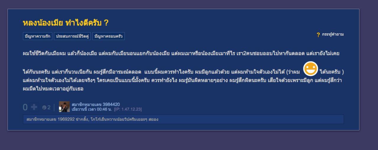 สมาชิกเว็บไซต์พันทิป หมายเลข 3984420 ตั้งกระทู้ หลงน้องเมีย ทำไงดีครับ ? โดยระบุว่า "ผมใช้ชีวิตกับเมียผม แล้วก็น้องเมีย แต่ผมเมา หรือน้องเมียเมาทีไร เรา 2 คนชอบออกไปหากันตลอด แต่เรายังไม่เคยได้กันนะครับ แต่เราก็นัวเนียกัน ผมรู้สึกมีอารมณ์ตลอด แบบนี้ผมควรทำไงครับ ผมมีลูกแล้วด้วย แต่ผมห้ามใจตัวเองไม่ได้เลยจริงๆ ใครเคยเป็นแบบนี้ไหมครับ ควรทำยังไง ผมรู้มันผิดหลายๆ อย่าง ผมรู้สึกผิดนะครับ เสียใจด้วย เพราะมีลูก แต่ผมรู้สึกว่าผมมืดไปหมดเวลาอยู่กับเธอ"