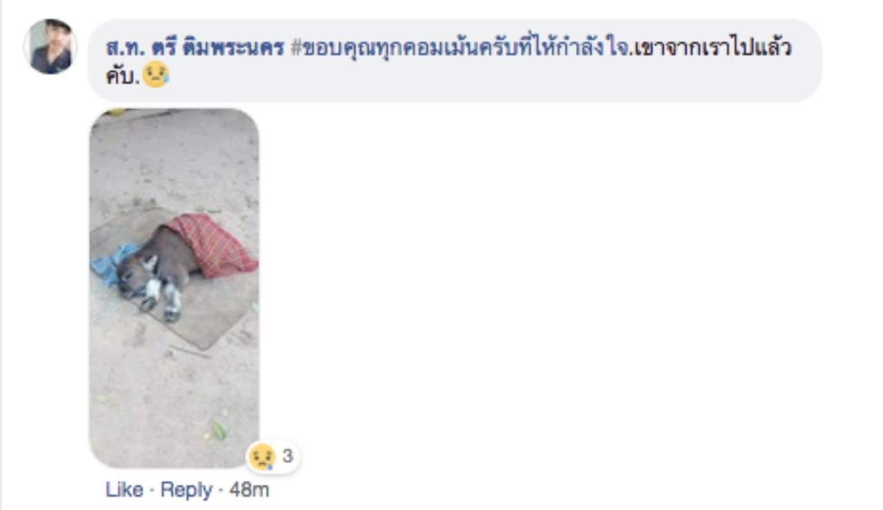 ล่าสุด วันที่ 6 ธ.ค.61 ผู้ใช้เฟซบุ๊ก ส.ท.ตรี ติมพระนคร ได้อัพเดตความคืบหน้าเกี่ยวกับลูกควายตัวดังกล่าว ลูกควายตัวนี้ไม่มีรูถ่าย และ ขอบคุณทุกคอมเมนต์ครับที่ให้กำลังใจ เขาจากเราไปแล้วครับ ซึ่งในเวลาต่อมาได้มีคนเข้ามาแสดงความเสียใจจำนวนมาก.