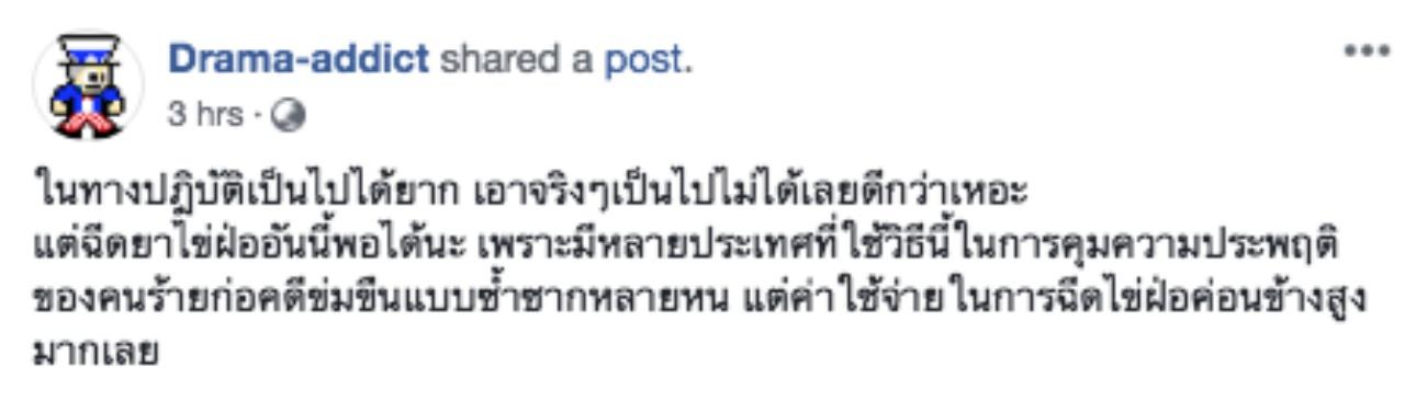 แฟนเพจ Drama-addict ได้แสดงความคิดเห็นกรณีโลกออนไลน์เสนอบทลงโทษนักโทษข่มขืนด้วยการตัดอวัยวะเพศว่า ในทางปฏิบัติเป็นไปได้ยาก เอาจริงๆ เป็นไปไม่ได้เลยดีกว่า แต่ฉีดยาไข่ฝ่อ อันนี้พอได้นะ เพราะมีหลายประเทศที่ใช้วิธีนี้ในการคุมความประพฤติของคนร้ายก่อคดีข่มขืนแบบซ้ำซากหลายหน แต่ค่าใช้จ่ายในการฉีดไข่ฝ่อค่อนข้างสูงมากเลย