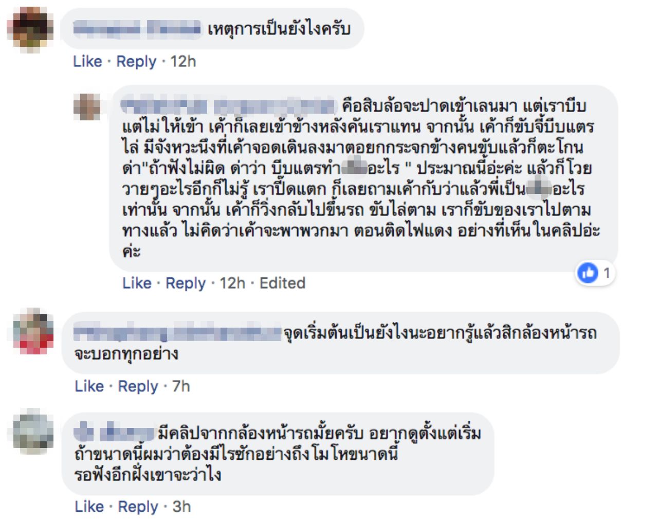 ทางด้านผู้โพสต์ยังได้ตอบเพิ่มในช่องแสดงความเห็นว่า “คือสิบล้อจะปาดเข้าเลนมา แต่เราบีบแตรไม่ให้เข้า เขาก็เลยเข้าข้างหลังคันเราแทน จากนั้นเขาก็ขับจี้บีบแตรไล่ มีจังหวะนึงที่เขาจอดเดินลงมาต่อยกระจกข้างคนขับแล้วก็ตะโกนด่า ถ้าฟังไม่ผิดด่าว่า บีบแตรทำ_อะไร ประมาณนี้อ่ะค่ะ แล้วก็โวยวายๆ อะไรอีกก็ไม่รู้ เราปรี๊ดแตกก็เลยถามเขากลับว่าแล้วพี่เป็น_อะไรเท่านั้น จากนั้นเขาก็วิ่งกลับไปขึ้นรถ ขับไล่ตาม เราก็ขับของเราไปตามทางแล้ว ไม่คิดว่าเขาจะพาพวกมาตอนติดไฟแดงอย่างที่เห็นในคลิปอ่ะค่ะ” ทั้งนี้ ชาวเน็ตบางส่วนยังไม่ปักใจเชื่อในเหตุการณ์ที่เกิดขึ้น และอยากจะขอดูหลักฐานจากกล้องหน้ารถว่าเป็นอย่างไรตั้งแต่ต้นก่อนจะมาเกิดเรื่อง ซึ่งหากมีความคืบหน้าจะรายงานให้ทราบต่อไป