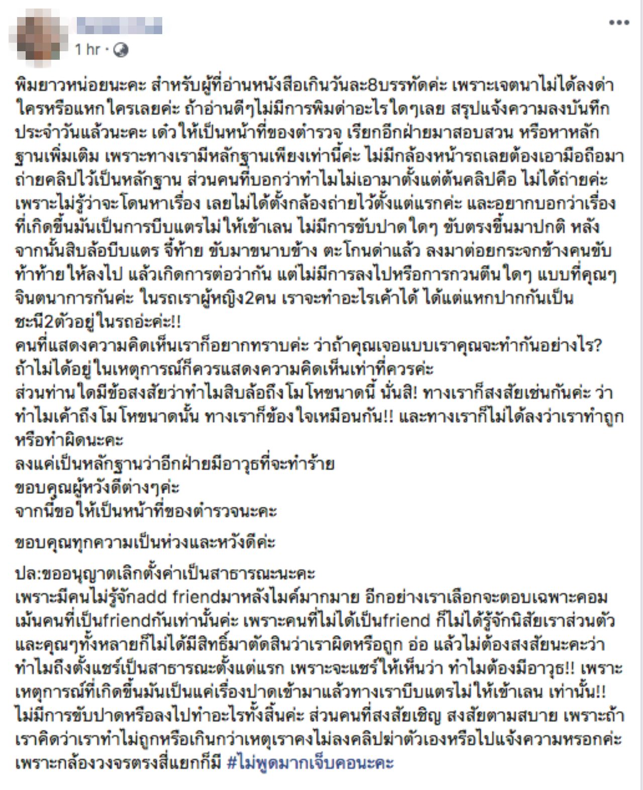 ขณะที่ล่าสุด พบว่าผู้ใช้เฟซบุ๊กได้เปลี่ยนการตั้งค่าออกจากสาธารณะแล้ว พร้อมชี้แจงว่า "แจ้งความลงบันทึกประจำวันแล้ว ให้เป็นหน้าที่ของตำรวจ เรียกอีกฝ่ายมาสอบสวน หรือหาหลักฐานเพิ่มเติม เพราะทางเรามีหลักฐานเพียงเท่านี้ค่ะ ไม่มีกล้องหน้ารถเลยต้องเอามือถือมาถ่ายคลิปไว้เป็นหลักฐาน ส่วนคนที่บอกว่าทำไมไม่เอามาตั้งแต่ต้นคลิปคือ ไม่ได้ถ่ายค่ะ เพราะไม่รู้ว่าจะโดนหาเรื่องเลยไม่ได้ตั้งกล้องถ่ายไว้ตั้งแต่แรกค่ะ และอยากบอกว่าเรื่องที่เกิดขึ้นมันเป็นการบีบแตรไม่ให้เข้าเลน ไม่มีการขับปาดใดๆ"