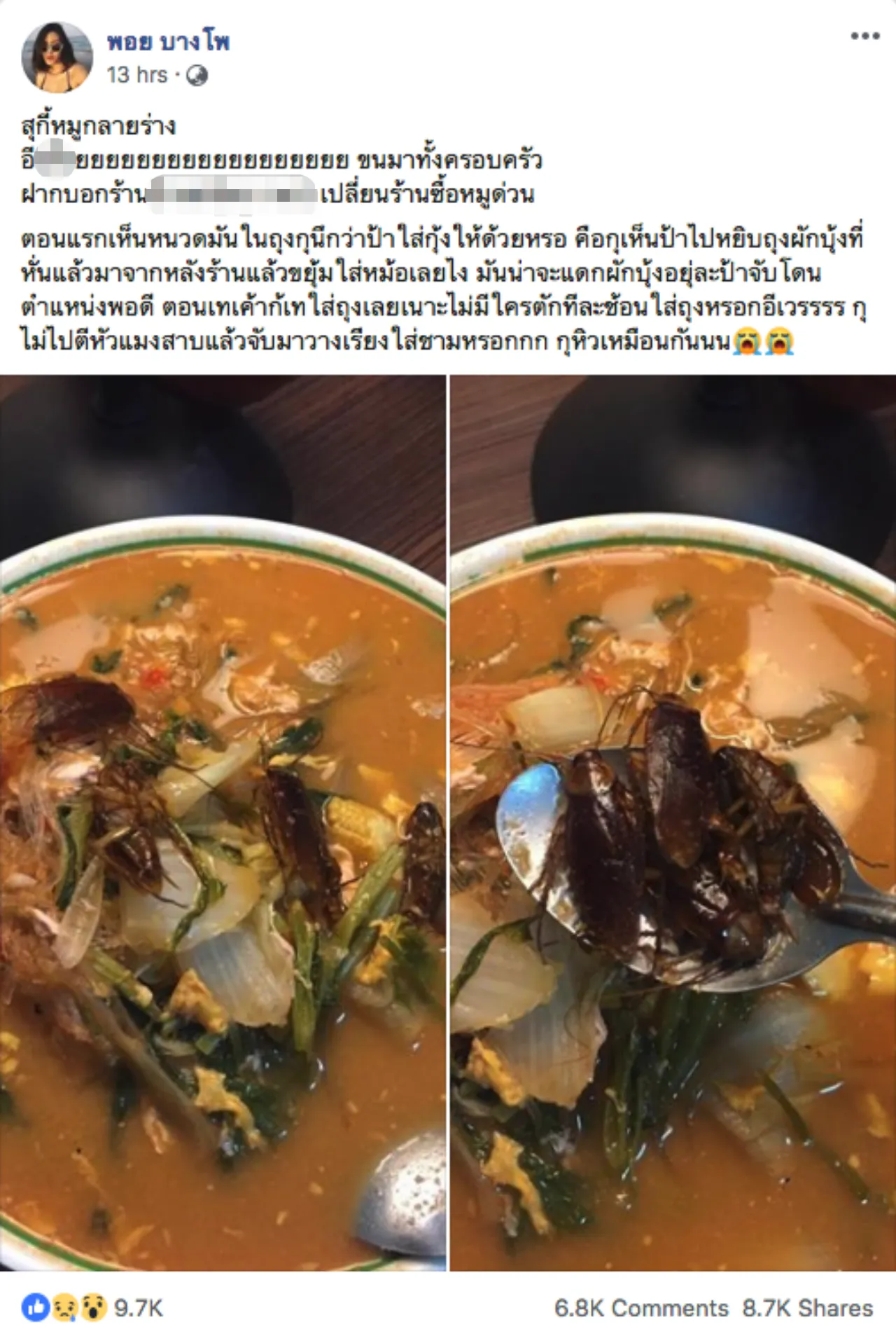 สาวโพสต์อ้างเจอแมลงสาบ 4 ตัวในสุกี้ที่ซื้อมาจากร้านอาหาร คาดอยู่ในผักบุ้งก่อนโดนจับใส่หม้อ ด้านชาวเน็ตแห่จับพิรุธ