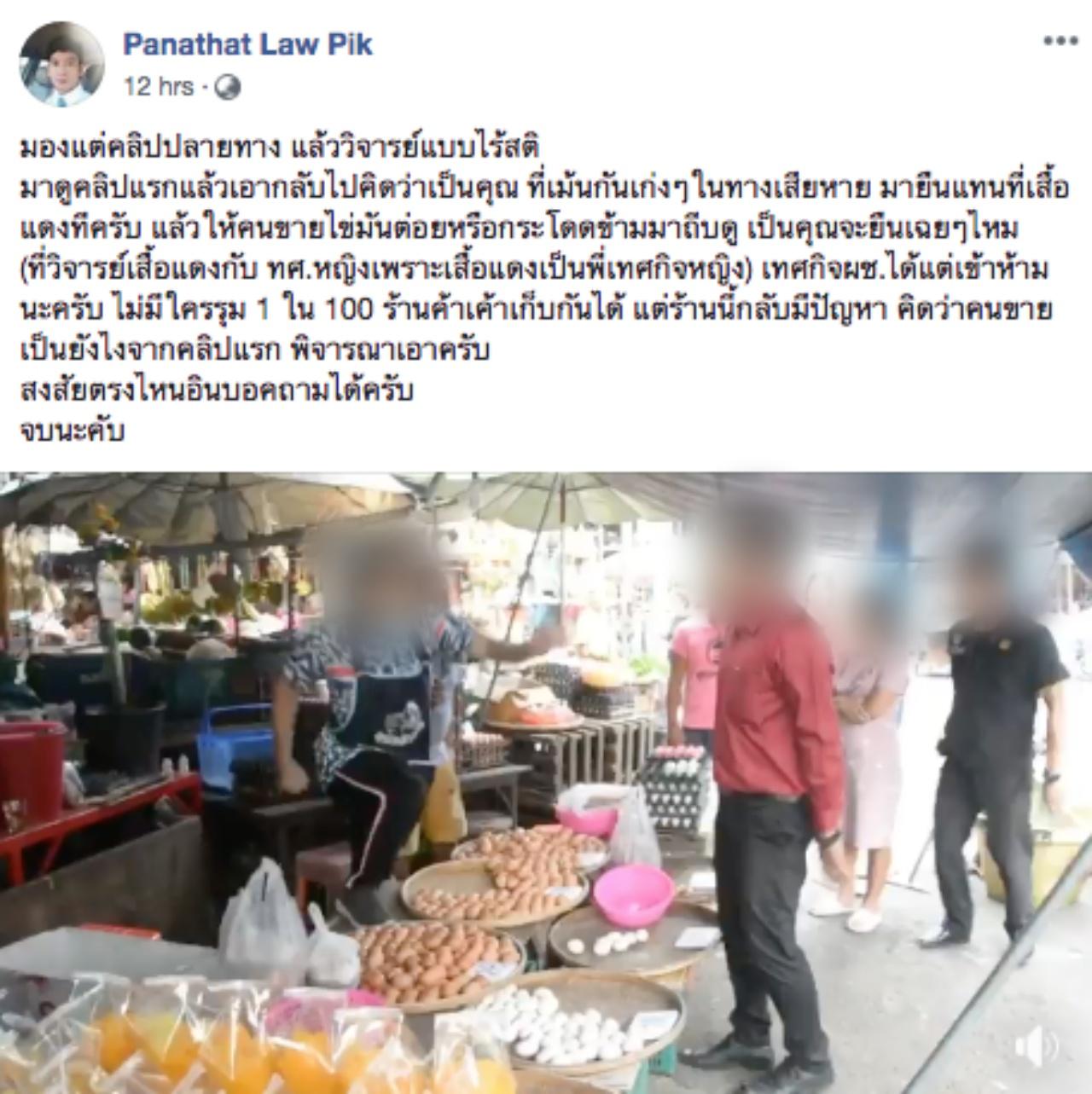 โดยล่าสุด มีรายงานว่า ผู้ใช้เฟซบุ๊ก Panathat Law Pik ได้โพสต์คลิปวิดีโอที่ระบุว่า เป็นคลิปแรกก่อนเกิดเหตุดังกล่าว ยืนยันว่า เทศกิจผู้ชายได้แต่เข้าห้าม ไม่มีใครรุม 1 ใน 100 ร้านค้าเขาเก็บกันได้ แต่ร้านนี้กลับมีปัญหา คิดว่าคนขายเป็นอย่างไรจากคลิปแรก พิจารณาเอาครับ