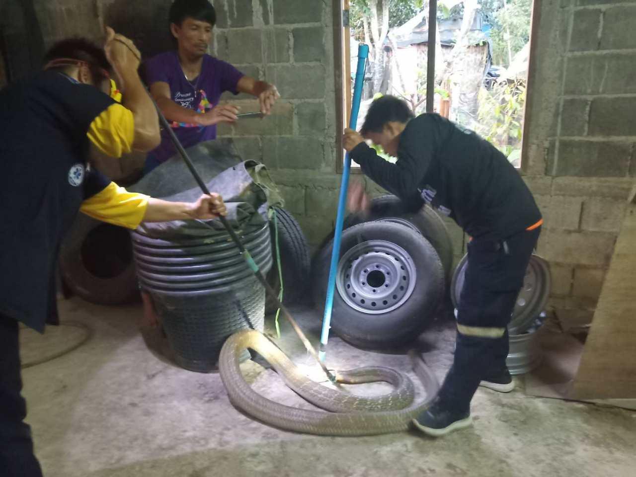 เมื่อเจ้าหน้าที่เดินทางไปถึง พบชาวบ้านจำนวนมากกำลังมุงดูอยู่ และพบกับนางโนยานี แวอุเซ็ง อายุ 24 ปี ยืนคอยอยู่หน้าบ้าน ด้วยอาการตกใจ และได้ชี้ให้เจ้าหน้าที่ดูที่กองยางซึ่งมีงูจงอางขนาดใหญ่ นอนขดตัวหลบอยู่ภายในล้อยางรถยนต์ เจ้าหน้าที่จึงได้ใช้อุปกรณ์เข้าจับงู นำมาวัดความยาวได้ประมาณ 4 เมตร น้ำหนัก 11 กิโลกรัม ก่อนที่จะนำใส่กระสอบเพื่อนำไปปล่อยคืนสู่ป่าธรรมชาติต่อไป