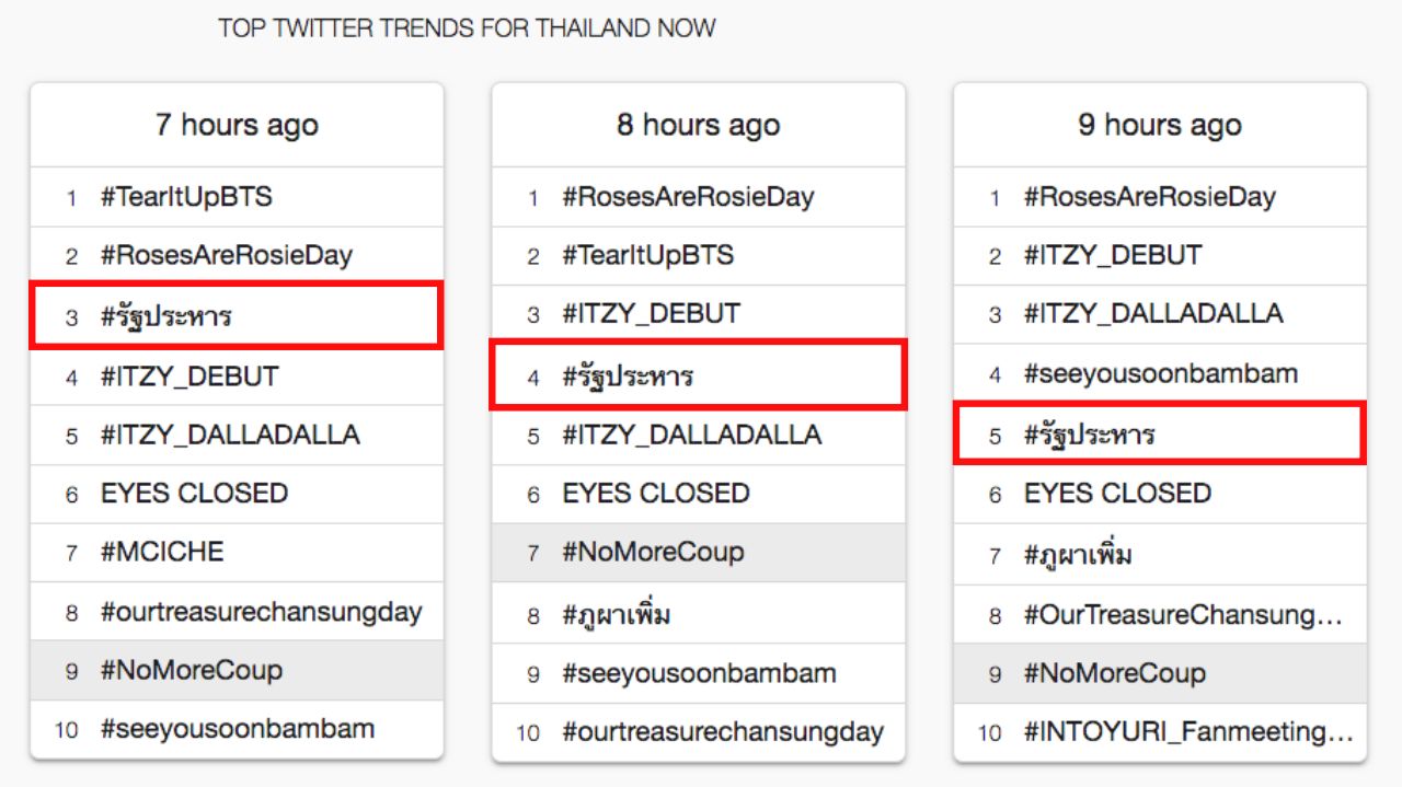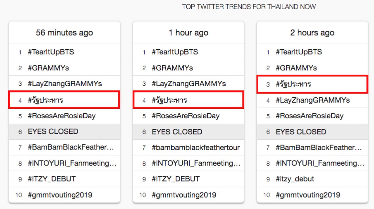 เมื่อวันที่ 11 ก.พ. 2562 ผู้สื่อข่าวรายงานการมีผู้ใช้แอคเคาน์ทวิตเตอร์จำนวนมาก ทวีตข้อความแล้วติดแฮชแท็ก #รัฐประหาร โดยแฮชแท็กรัฐประหารนี้ ติด 1 ใน 10 ของไทยแลนด์เทรนด์ตั้งแต่ 9 ชั่วโมงที่ผ่านมา โดยอ้างอิงจากเว็บไซต์ trends24.in ซึ่งขึ้นมาสูงที่สุดที่อันดับ 2 และต่ำสุดที่อันดับ 5