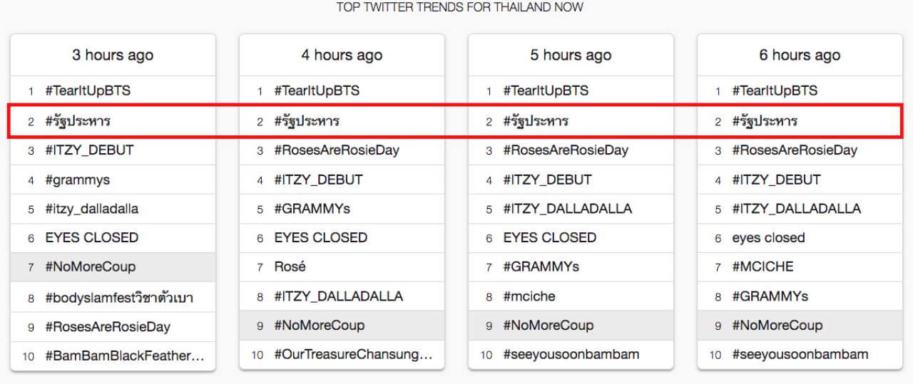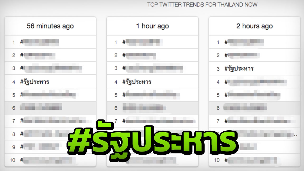 ทั้งนี้ ล่าสุดเมื่อเวลา 08.31 น. วันนี้ แฮชแท็ก #รัฐประหาร ก็ยังคงติดอยู่ที่อันดับ 4 ของไทยแลนด์เทรนด์