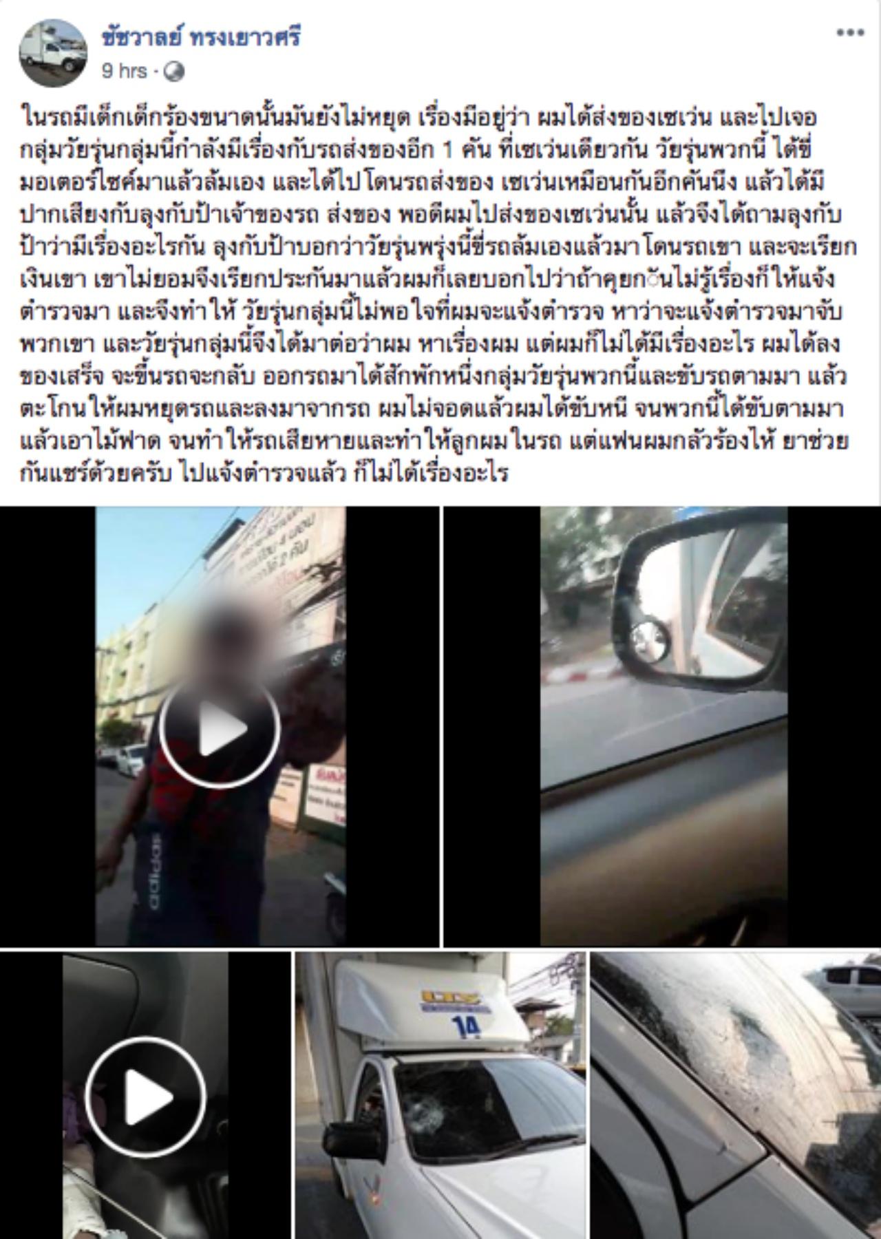 จากกรณีผู้ใช้เฟซบุ๊ก ชัชวาลย์ ทรงเยาวศรี โพสต์คลิปและข้อความว่า ตนเองได้ขับรถส่งของพร้อมภรรยาและลูก ถูกกลุ่มวัยรุ่นขี่รถตาม พยายามเปิดประตูรถเข้ามาทำร้าย ใช้หินทุบกระจกหน้ารถ จนลูกน้อยที่นั่งในรถร้องไห้เพราะตกใจกลัว