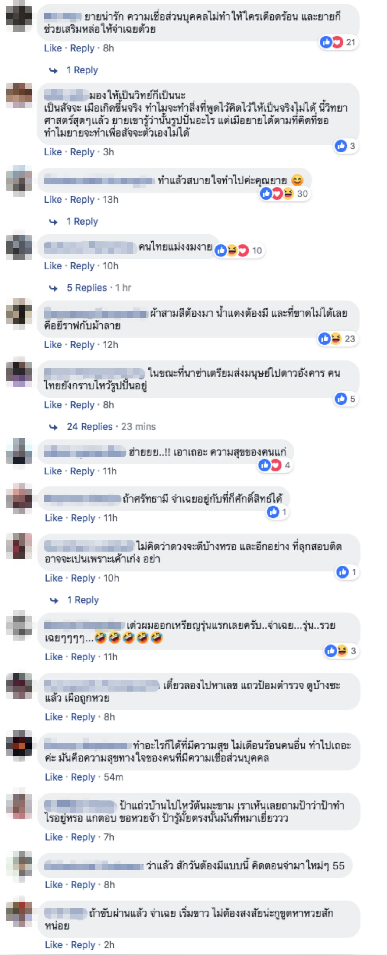 ทางด้านผู้ใช้เฟซบุ๊กรายอื่นๆ ต่างเข้ามาแสดงความคิดเห็นอย่างหลากหลาย และมีหลายรายบอกว่าอยากให้มองว่าลูกมีความสามารถที่สอบได้มากกว่าที่จะทำแบบนี้ ขณะที่บางส่วนมองว่าเป็นความสบายใจของคุณยายที่ทำแล้วไม่ได้เดือดร้อนใคร.