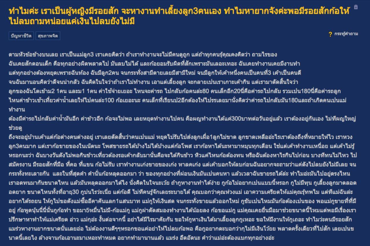 สมาชิกหมายเลข 5156955 ตั้งกระทู้ ทำไมค่ะ เราเป็นผู้หญิงมีรอยสัก จะหางานทำเลี้ยงลูก 3 คนเอง ทำไมหายากจังค่ะ พอมีรอยสักก้อให้ไปลบถามหน่อยแค่เงินไปลบยังไม่มี พร้อมระบุโดยสรุปว่า เราเป็นแม่ลูก 3 เราเคยคิดว่า ถ้าเราทำงานจะไม่มีคนดูถูก ฉันเคยสักตอนเด็ก คือ ทุกอย่างผิดพลาดไป มันลบไม่ได้ และก็ยอมรับผิดที่สัก เพราะมันเลอะเทอะ ฉันเคยทำงานเคยมีงานทำ