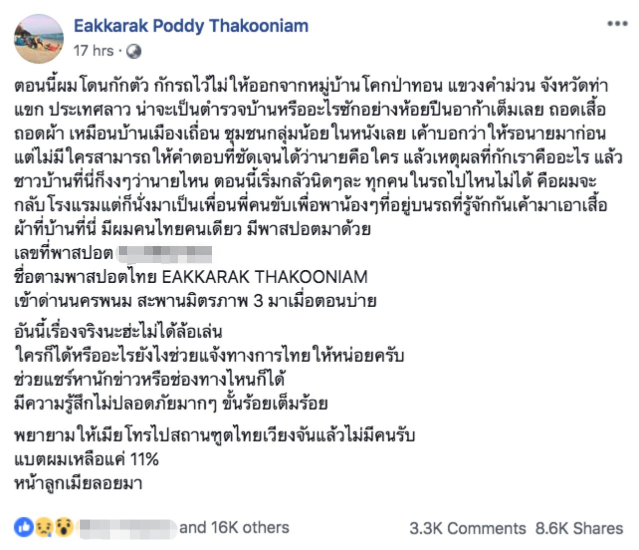 เมื่อวันที่ 19 มีนาคม 2562 ผู้สื่อข่าวรายงานความคืบหน้ากรณีมีการเผยแพร่ข้อมูลของหนุ่มไทย ที่เดินทางเข้าไปท่องเที่ยวในแขวงคำม่วน สปป.ลาว โดยเดินทางผ่านด่านพรมแดนสะพานมิตรภาพไทยลาว แห่ง ที่ 3 นครพนม คำม่วน และมีการยื่นพาสปอร์ตออกตามช่องทางถูกต้องตามกฎหมาย จากนั้นถูกทางเจ้าหน้าที่กักตัวไว้ไม่ให้กลับ จึงได้มีการโพสต์เฟซบุ๊กขอความช่วยเหลือมาทางครอบครัว และทางการไทย ทราบชื่อคือ นายเอกลักษณ์ ตะโกเนียม ได้ขับรถยนต์เข้าไปท่องเที่ยวเมื่อวันที่ 18 มีนาคม 2562 ที่ผ่านมา ปัจจุบันถูกคุมตัวไว้ในหมู่บ้าน บ้านโคกป่าทอน ของแขวงคำม่วน สปป.ลาว
